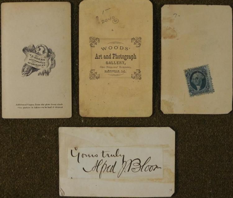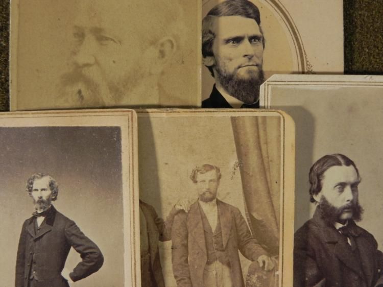 These five antique Carte de Visite photographs are all studio portraits of men with terrific beards and moustaches. Two are named, including Boreman, with stamp on the back, and one is signed on back by Alfred J. Bloom. Two studios are marked on back, from California and New York. One man has no beard, but it s a nice shot, side by side holding hats. The sizes are standard, 2 1/2 x 4 inches. Their conditions are good to very good, with clear images, but some wear, torn bottom on one and dent. * It is more rare to find outdoor scenes on CDV's like these.