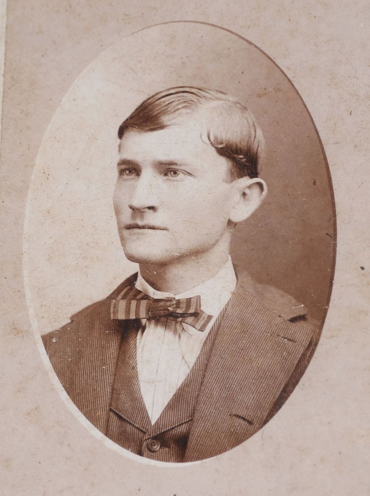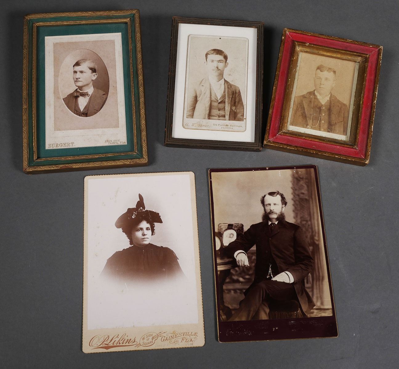Five antique photos from Florida photographers: 1) O.P. Likins Art Photography, Gainesville. 2) J.S. Mitchell Jacksonville. 3) Geoge Brown, St. Augustine. 4) G.W. Shear, DeFuniak Springs. 5) Burgert, Ybor City Tampa. Photos range in size from 6 1/2" x 4 1/4" to 4 1/4" x 2 1/2". See photos for more details on condition.