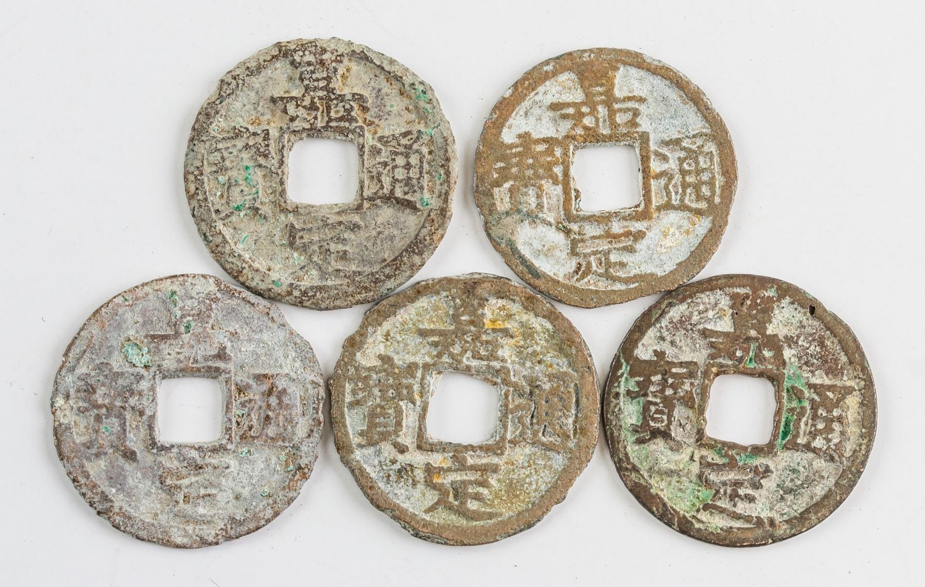 Five (5) assorted Chinese Southern Song dynasty Jiading (1208-1224) Tongbao bronze coins; 1. D: 24.62 mm, 3.651 grams; 2. D: 23.74 mm, 3.117 grams; 3. D: 24.64 mm, 3.314 grams; 4. D: 24.62 mm, 3.043 grams; 5. D: 24.56 mm, 3.227 grams;