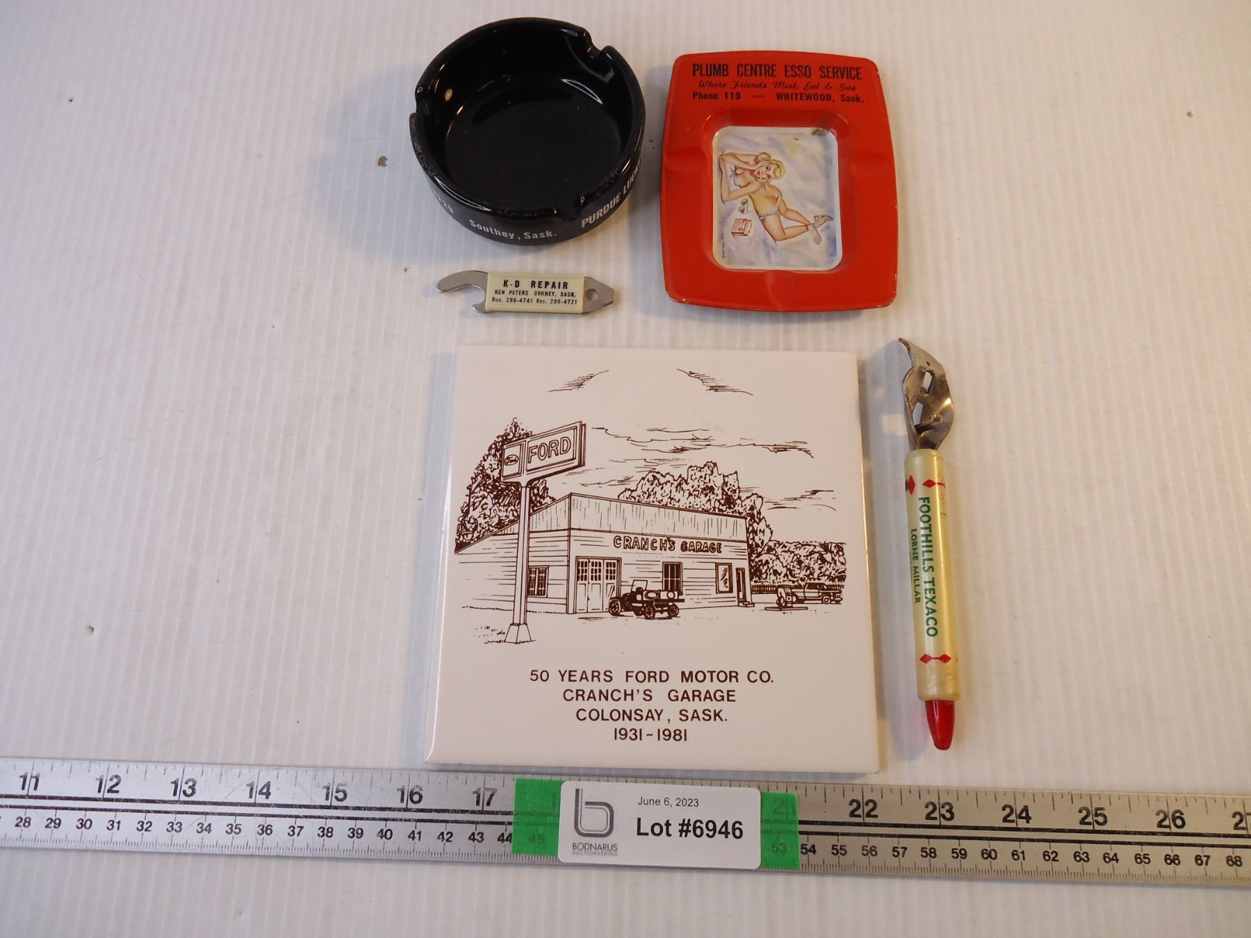 (5) Assorted Advertising Items-Openers, Ashtrays Ford Plaque
