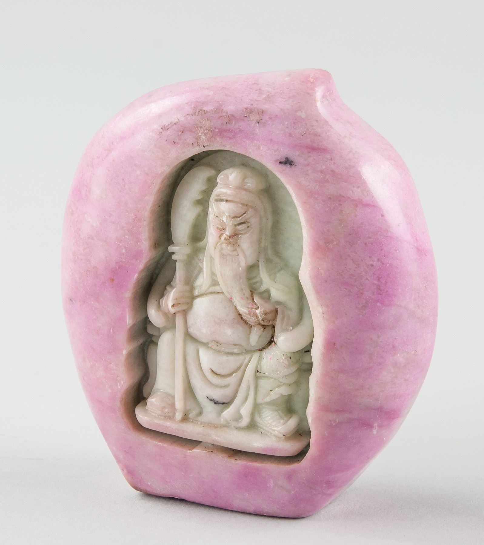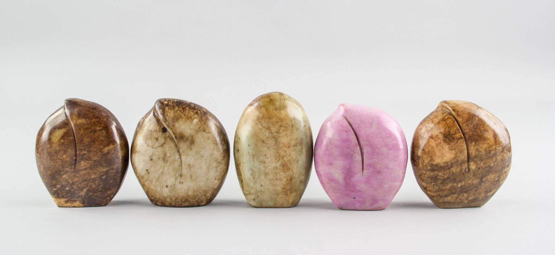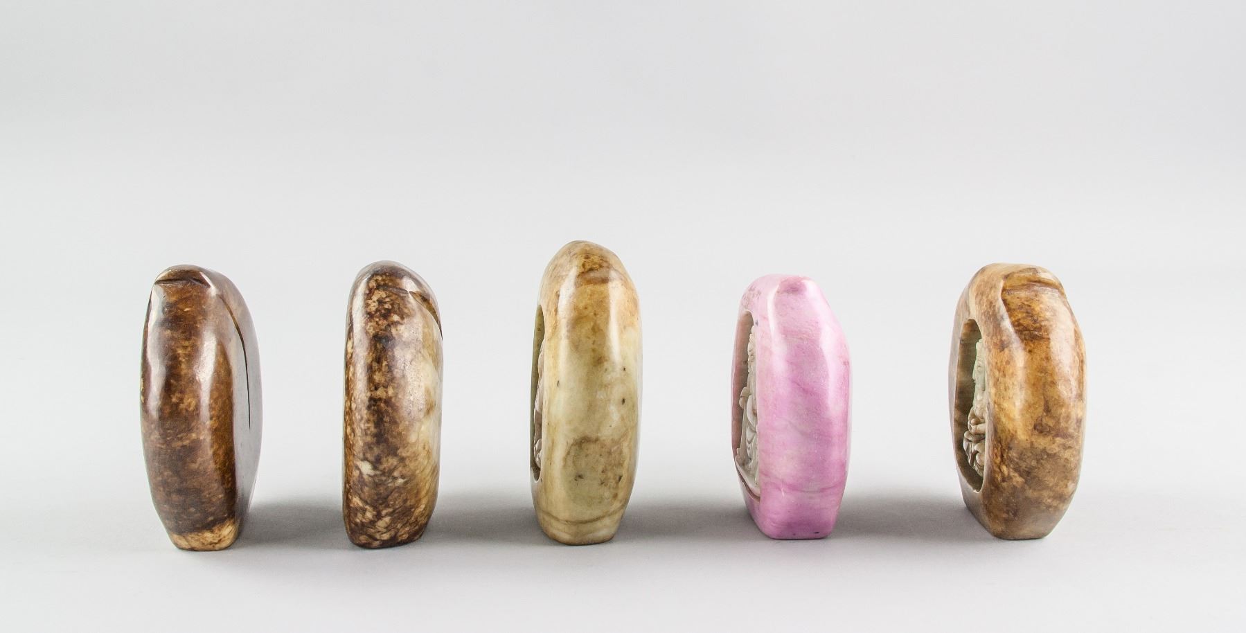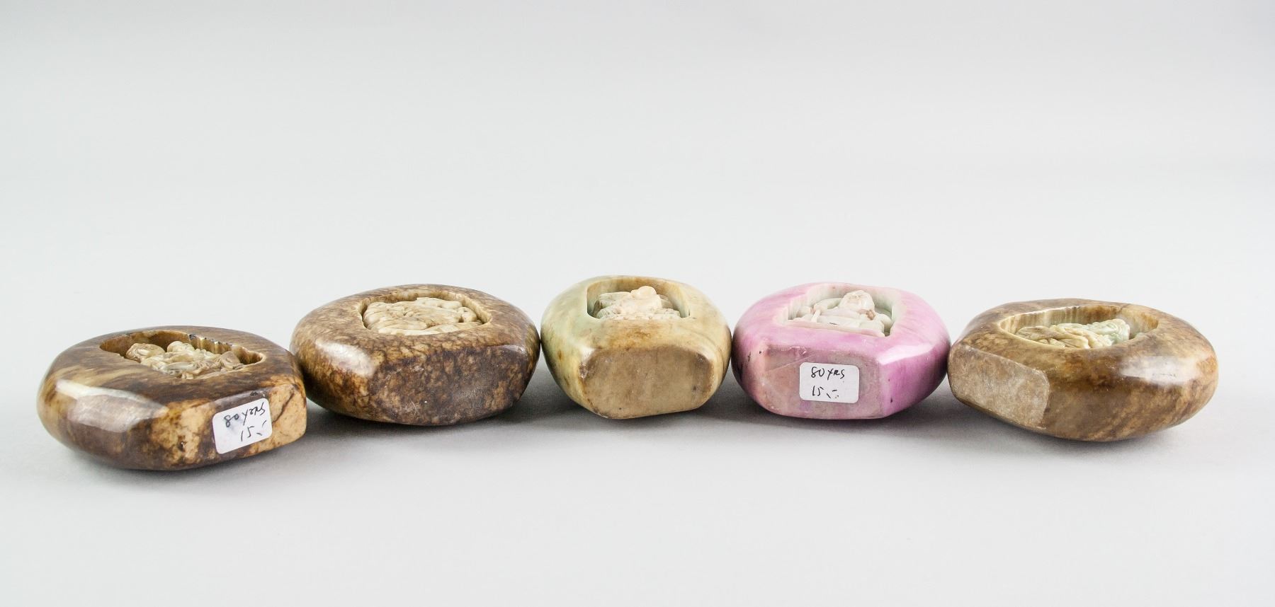 Five (5) assorted Chinese hardstone carved boulder, with relief carving of immortal, monkey on horse, crane, Guan Gong and eight-arm Guanyin, back carved in a peach form, 9 x 8 cm, 354 grams each. PROVENANCE: Private collection, Scarborough, Ontario