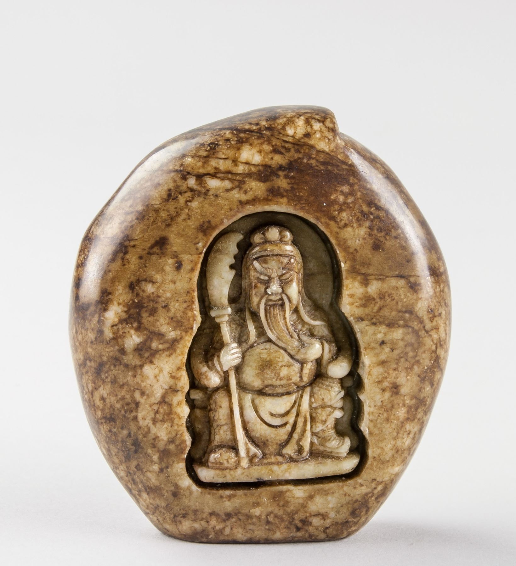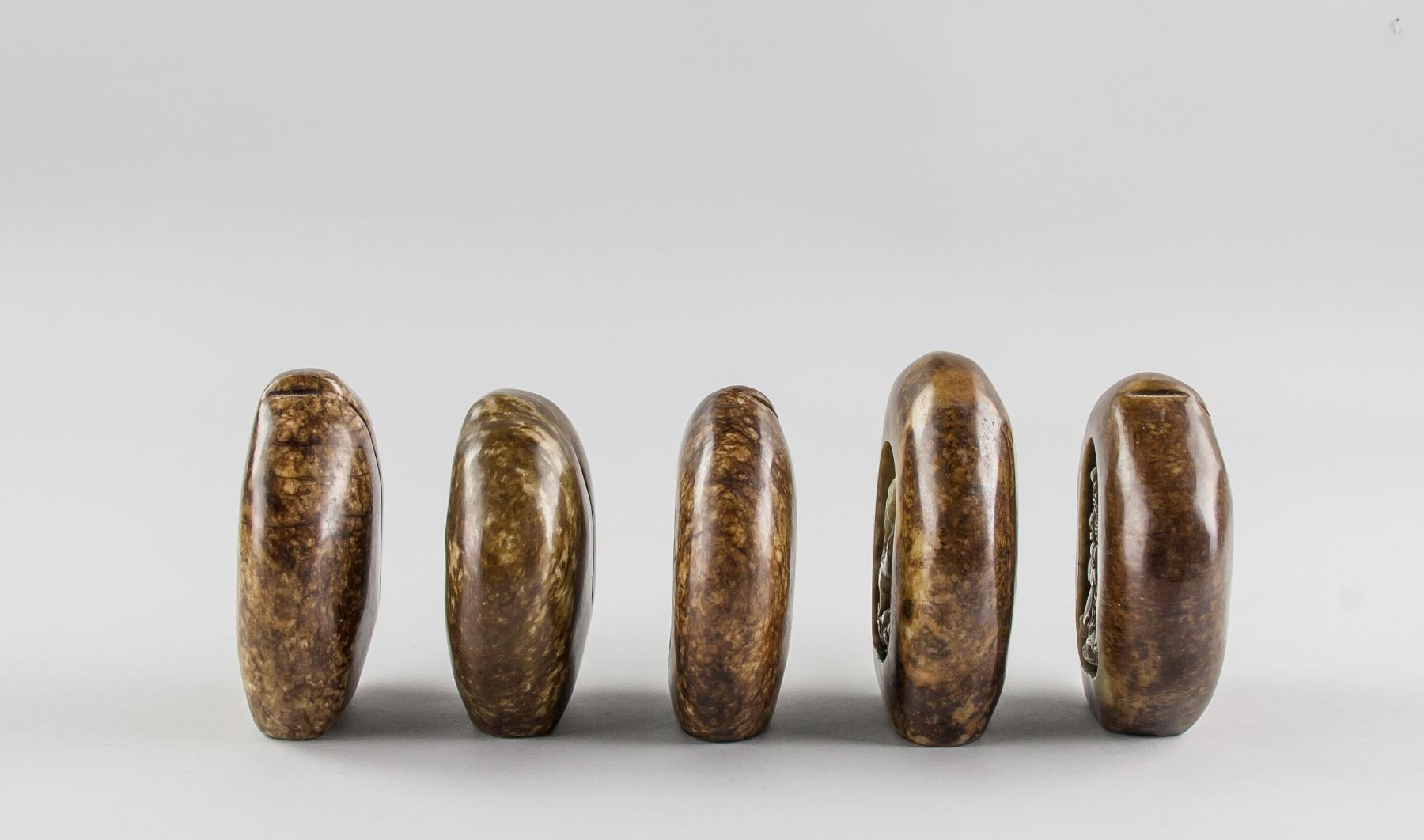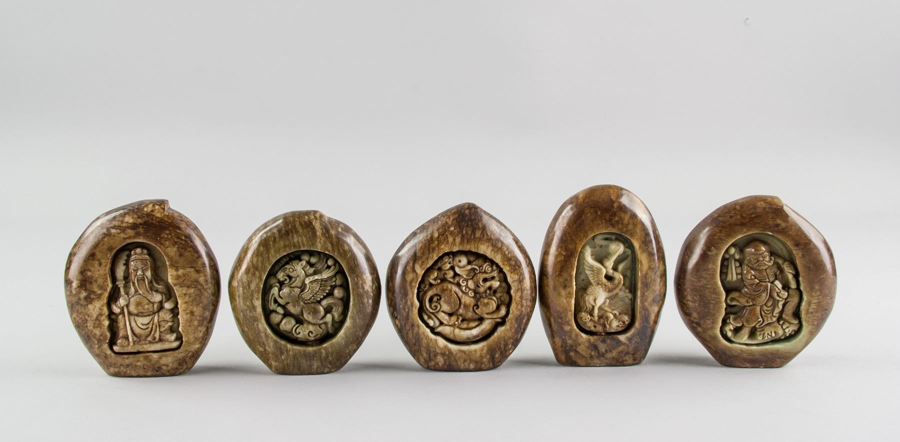 5 assorted Chinese hardstone carved boulders; with relief carving of Guan Gong, flying horse; dragon, crane and Bodhidharma; back carved in peach from; of dark brown tone; 9 x 8 cm, 450 grams each. PROVENANCE: Private collection, Scarborough, Ontario