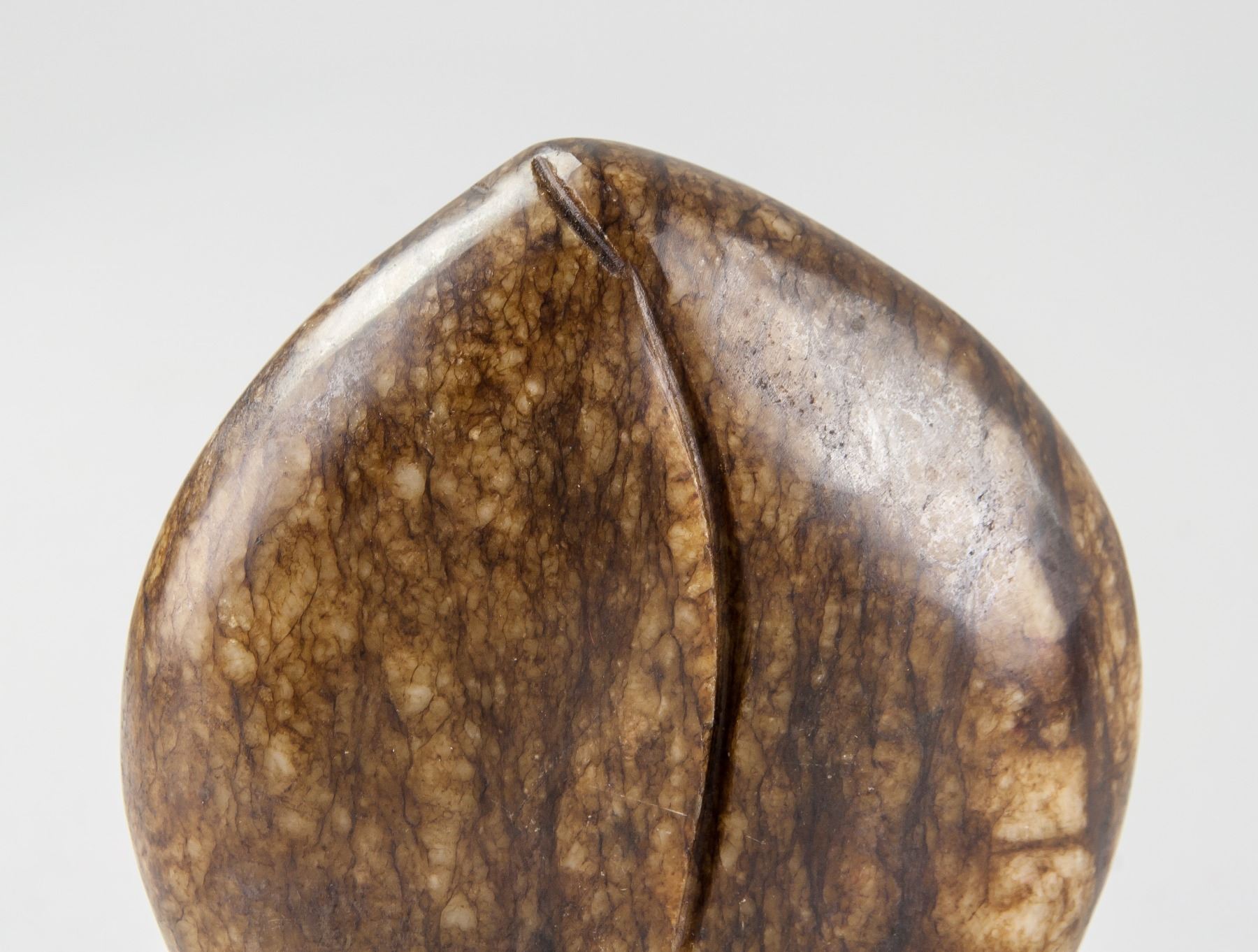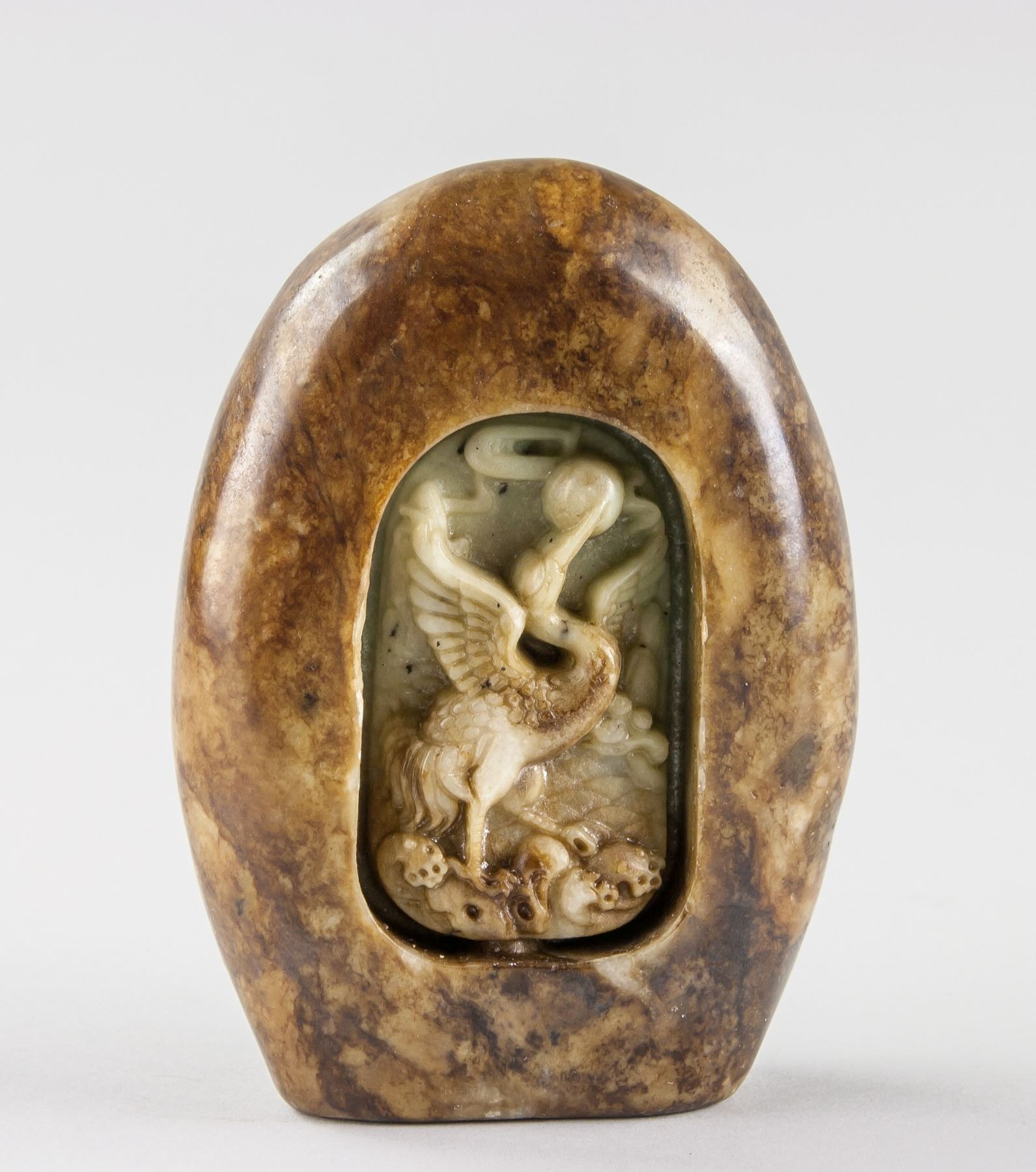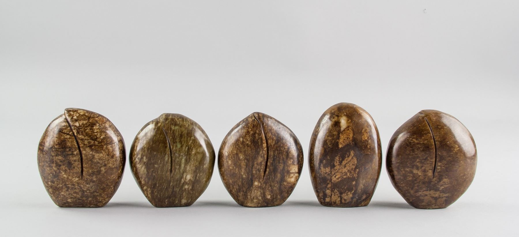 5 assorted Chinese hardstone carved boulders; with relief carving of Guan Gong, flying horse; dragon, crane and Bodhidharma; back carved in peach from; of dark brown tone; 9 x 8 cm, 450 grams each. PROVENANCE: Private collection, Scarborough, Ontario