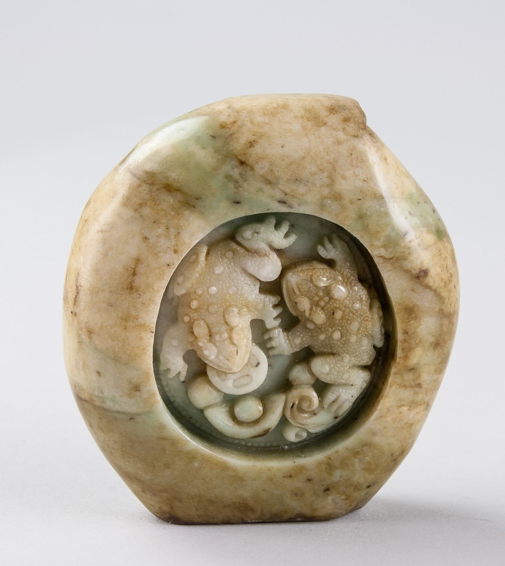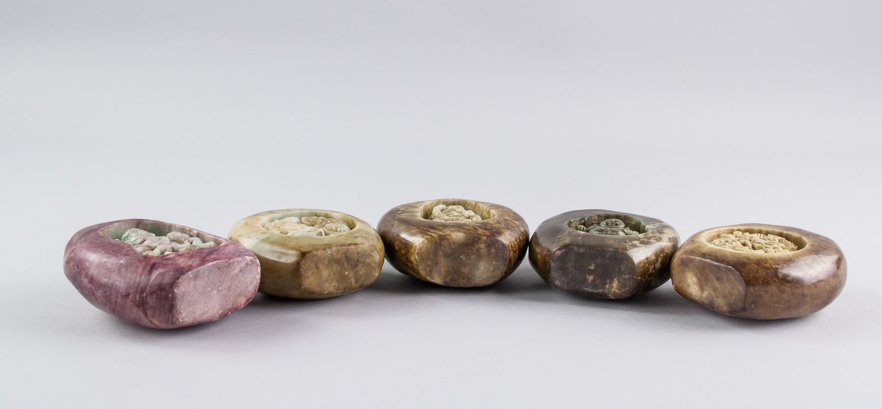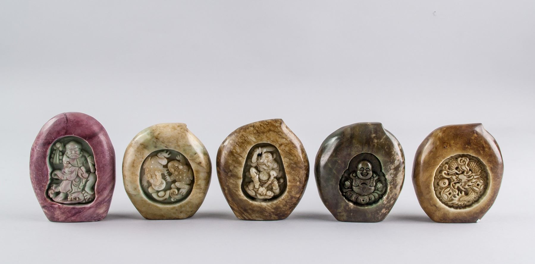 Five assorted Chinese hardstone carved boulder, with relief carving of Bodhidharma, toads, Zhong Kui, Happy Buddha and dragon, back carved in a peach form, 9 x 8 cm, 418 grams. PROVENANCE: Private collection, Scarborough, Ontario