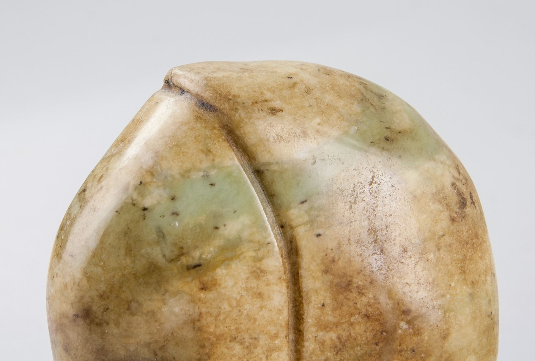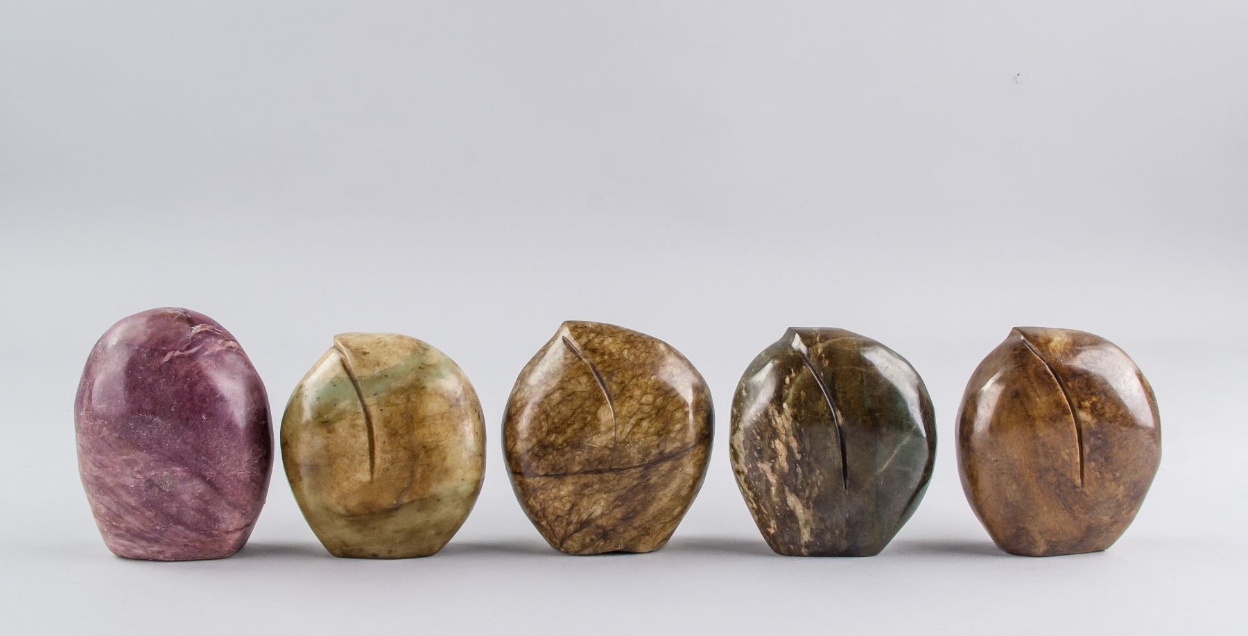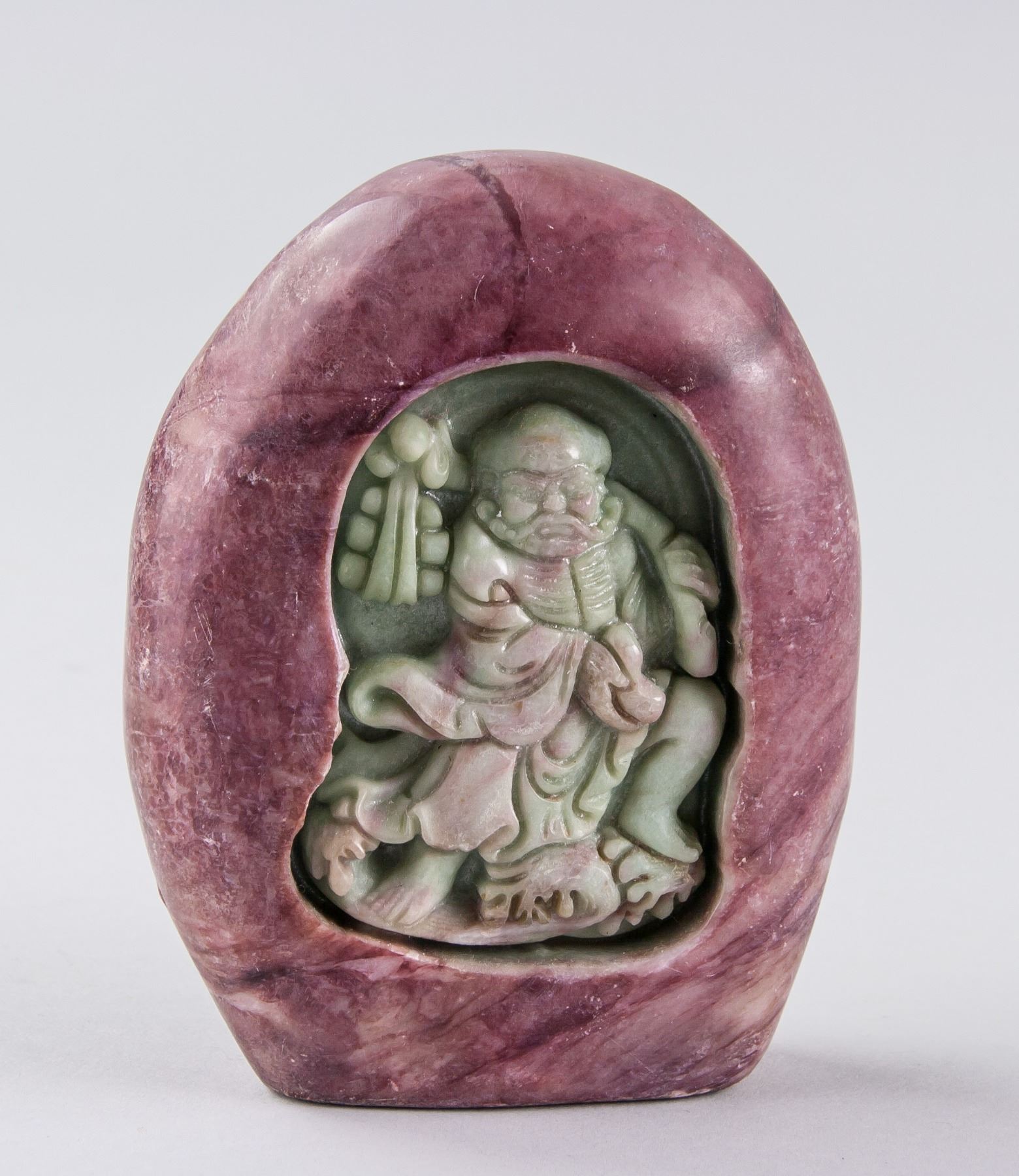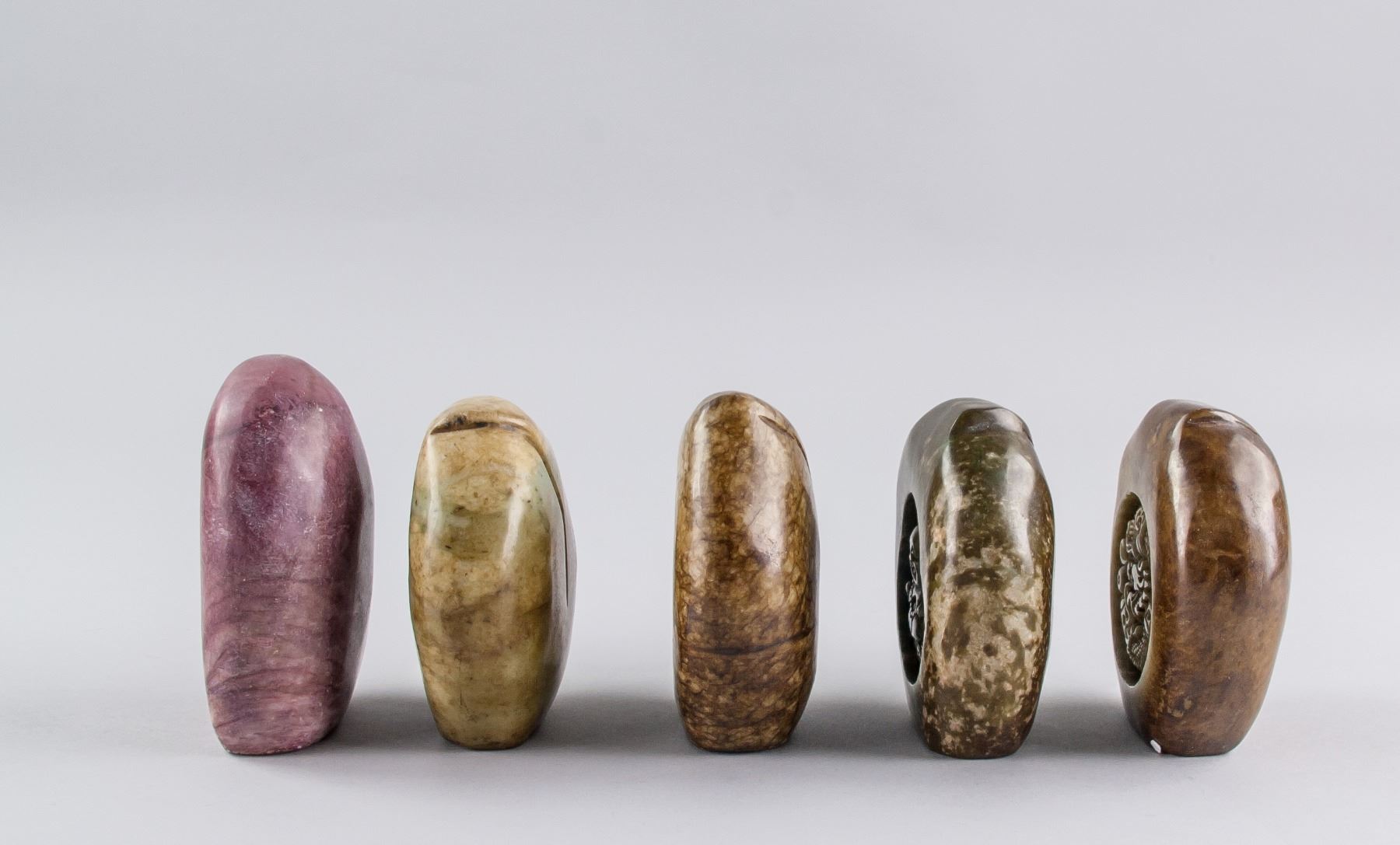 Five assorted Chinese hardstone carved boulder, with relief carving of Bodhidharma, toads, Zhong Kui, Happy Buddha and dragon, back carved in a peach form, 9 x 8 cm, 418 grams. PROVENANCE: Private collection, Scarborough, Ontario