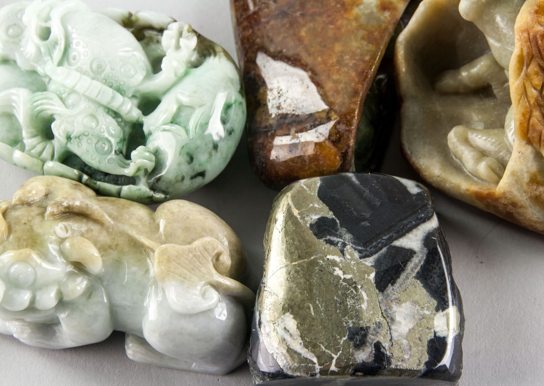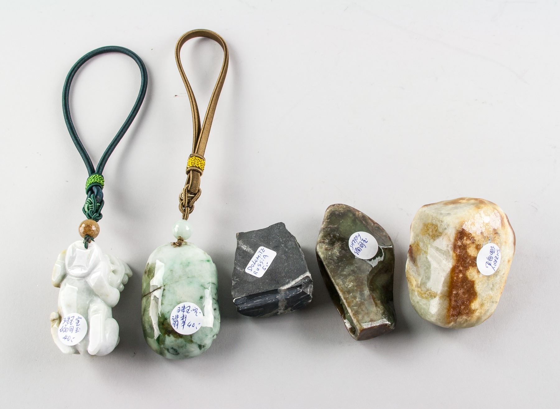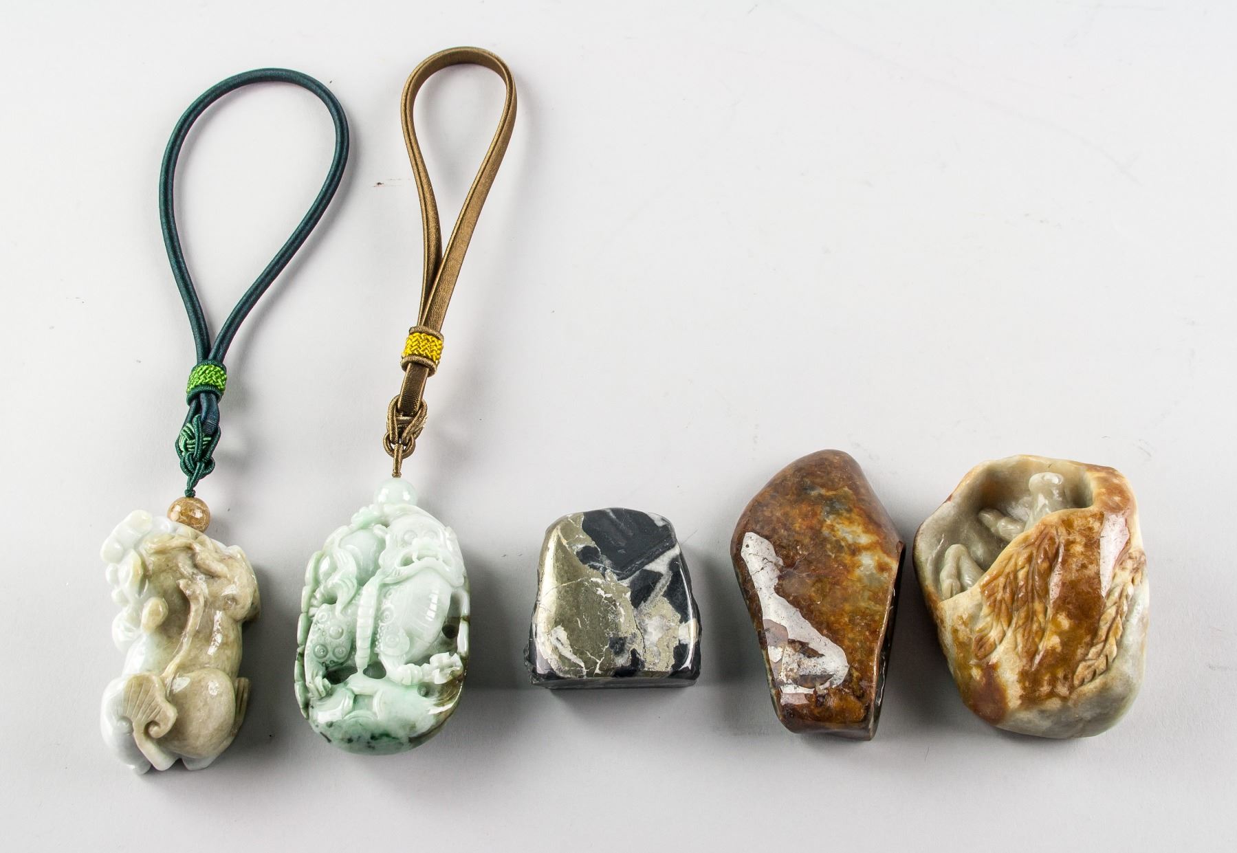 Five (5) assorted Chinese hardstone, jade and jadeite item,s of two toggles and three boulders, total weight: 947.68 grams, Density: 2.24-3.03, H:5-8 cm, W: 4.5-6.5 cm.