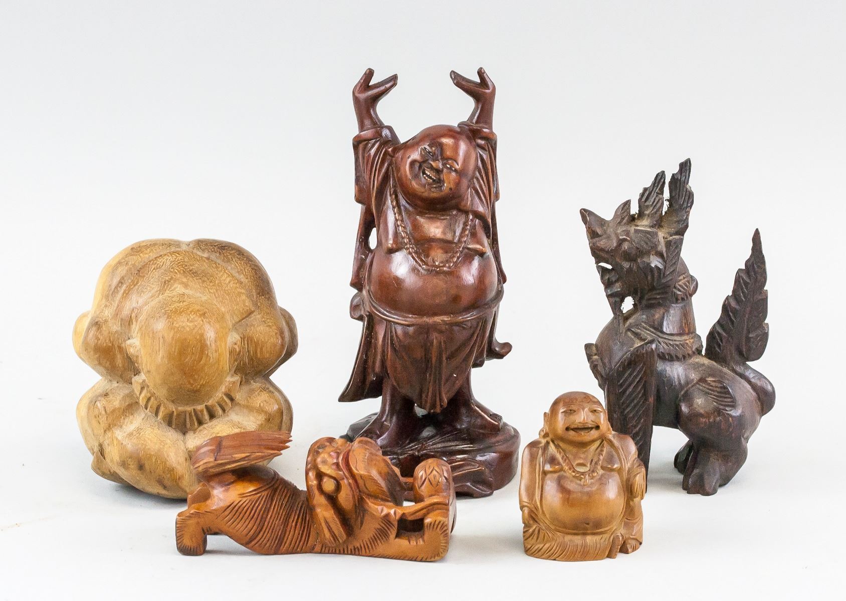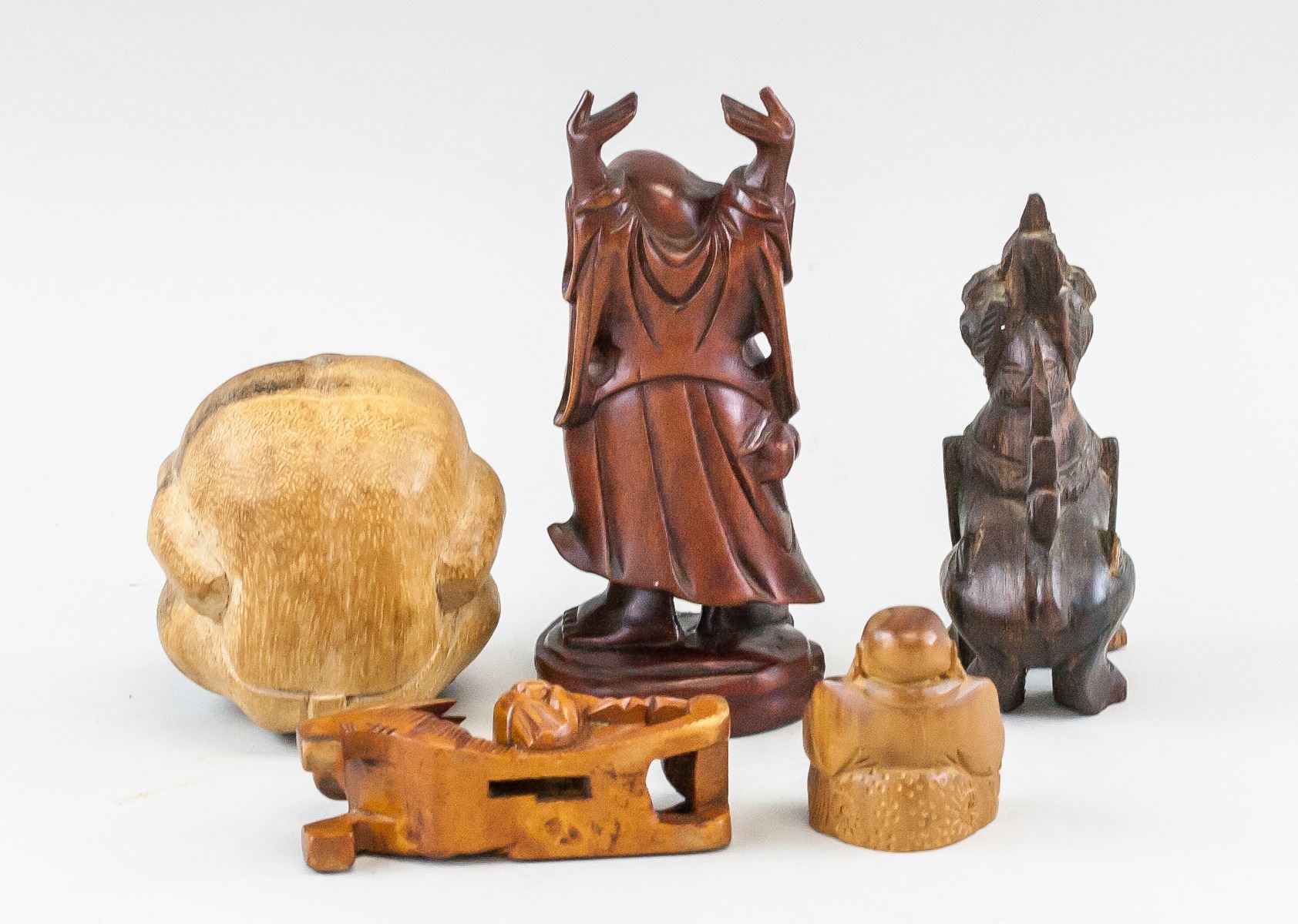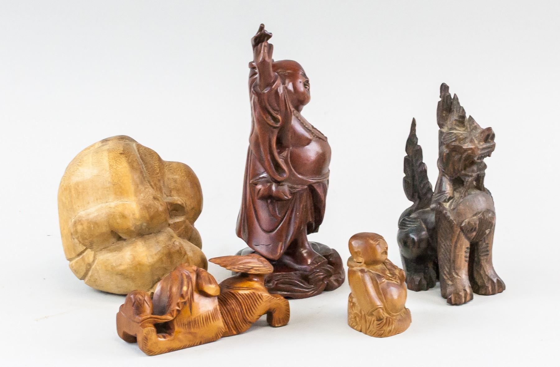 Five (5) assorted Chinese wood carved items. Featuring 2 Happy Buddha figures, a lion, a beast, and a wailing man figure. 16 x 8 cm, 516 grams (total)