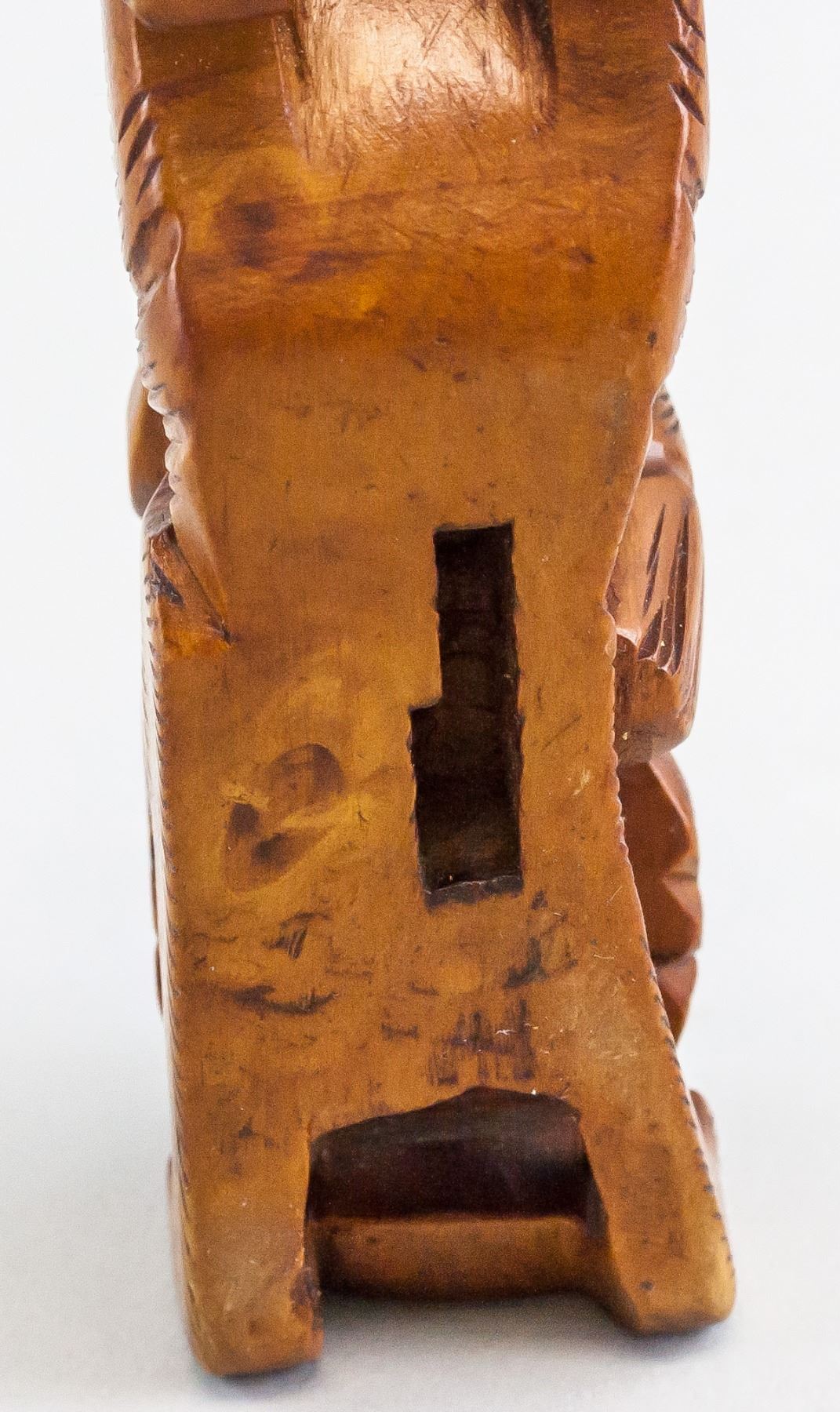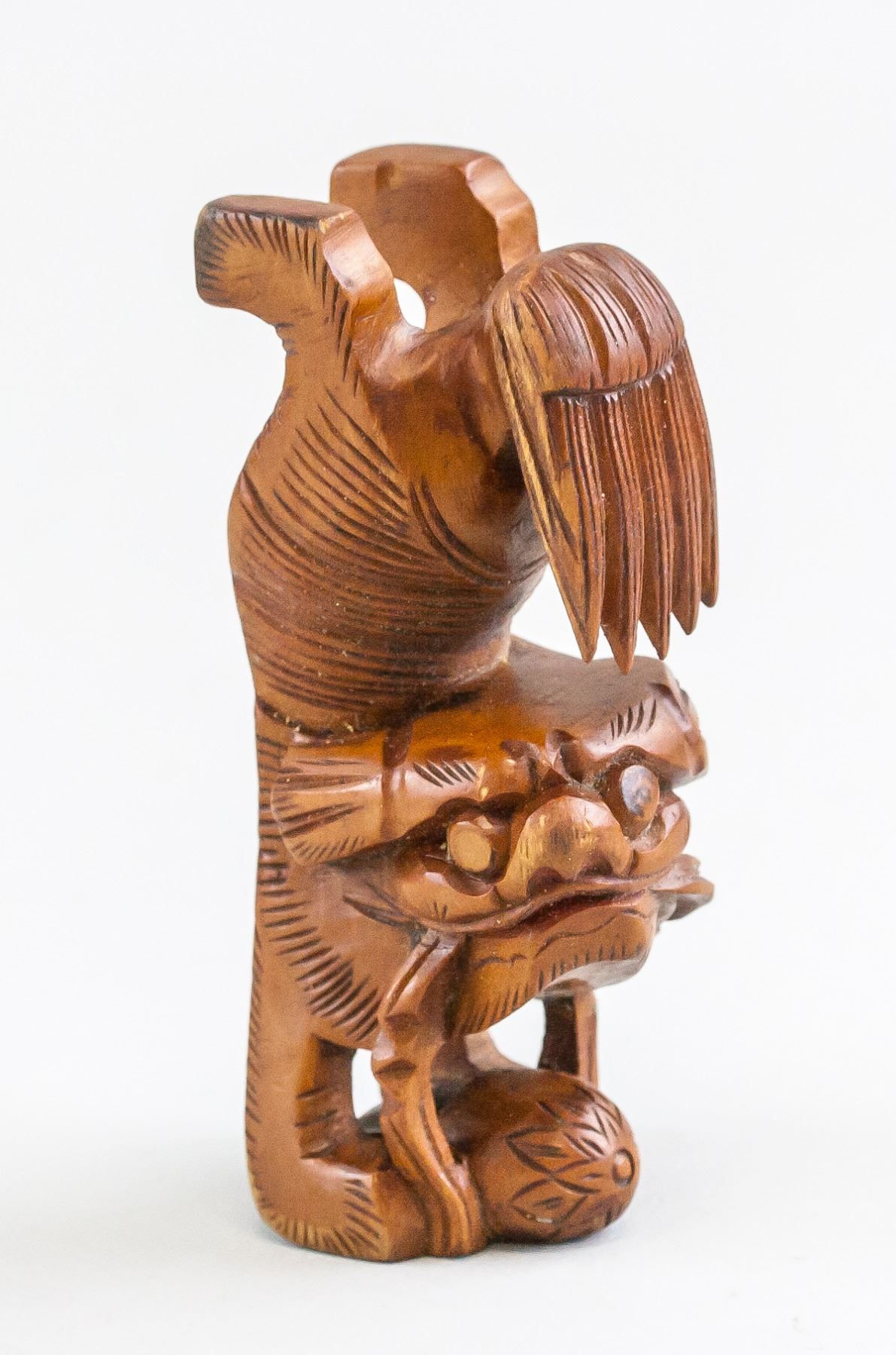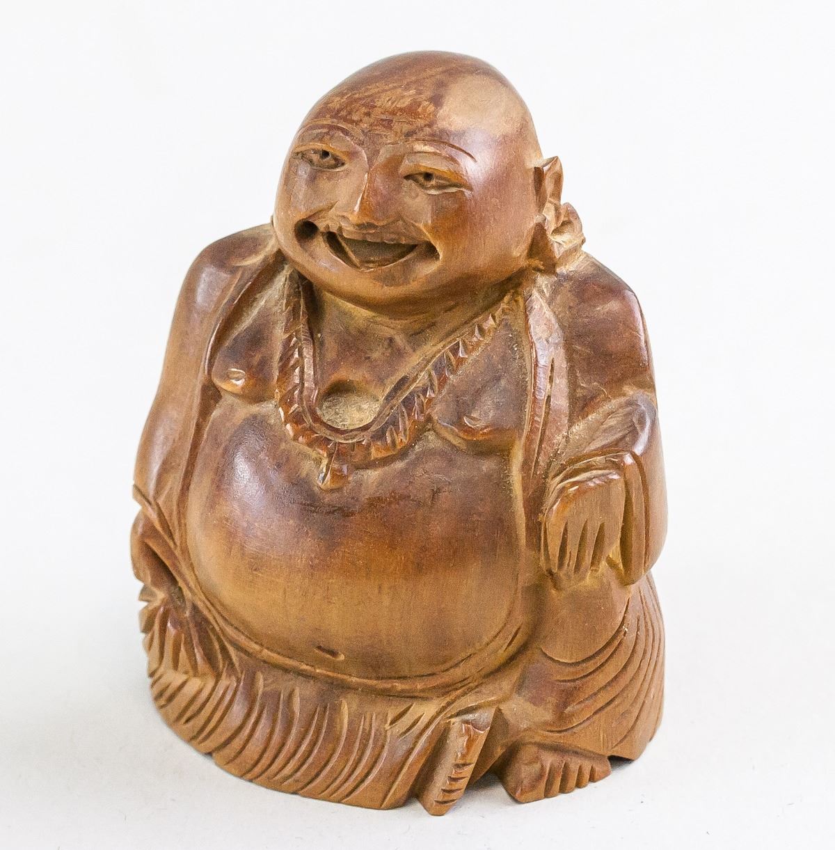 Five (5) assorted Chinese wood carved items. Featuring 2 Happy Buddha figures, a lion, a beast, and a wailing man figure. 16 x 8 cm, 516 grams (total)