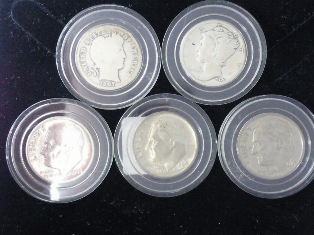 1907 Barber, 1920 Mercury, 1946-D Roosevelt, 1969-D Roosevelt, 1971 Roosevelt