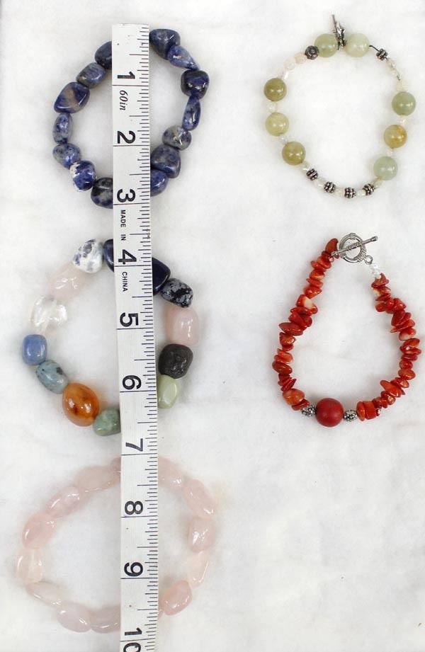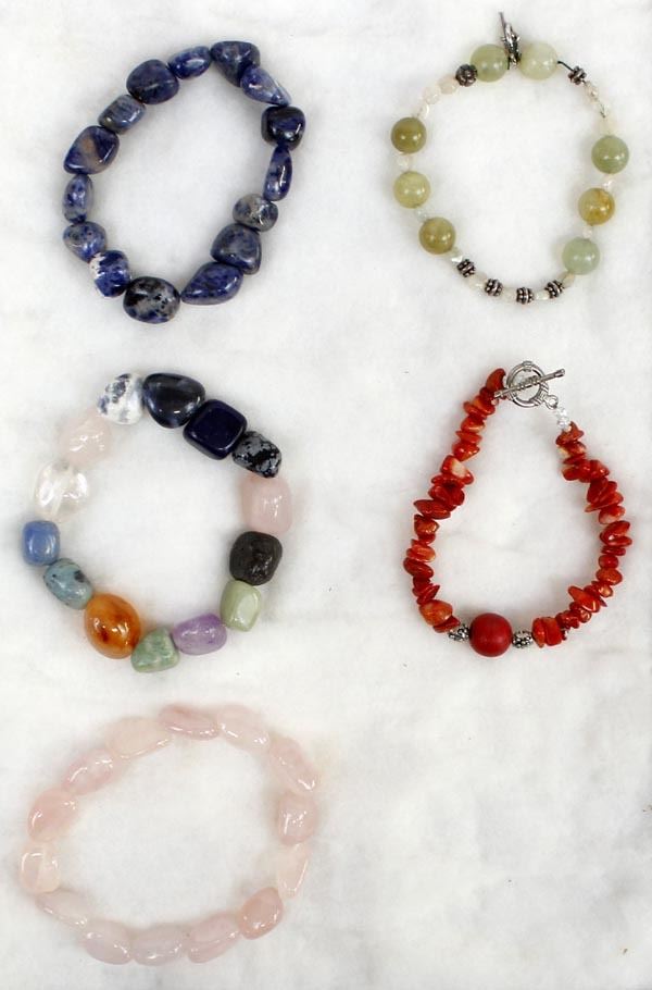 5 Assorted Semi-precious Stone Bracelets, longest measures 8''L end to end, 3 are on stretch elastic and 2 have toggle closures, lots of beautiful colors