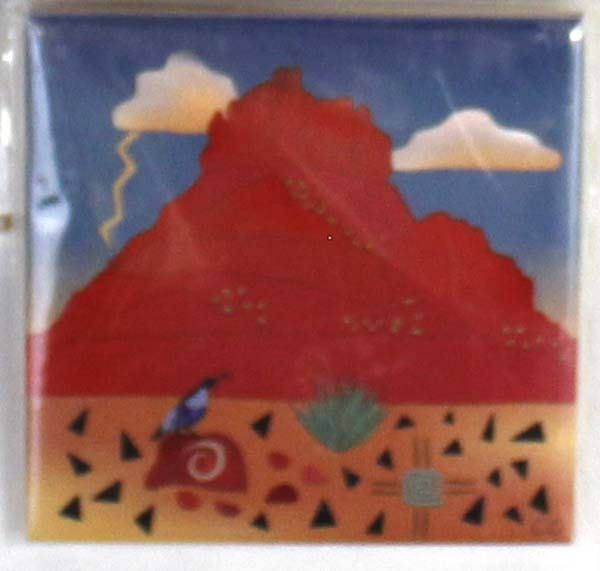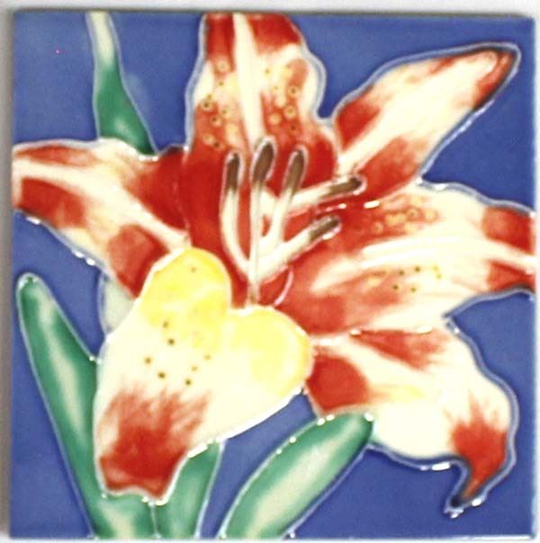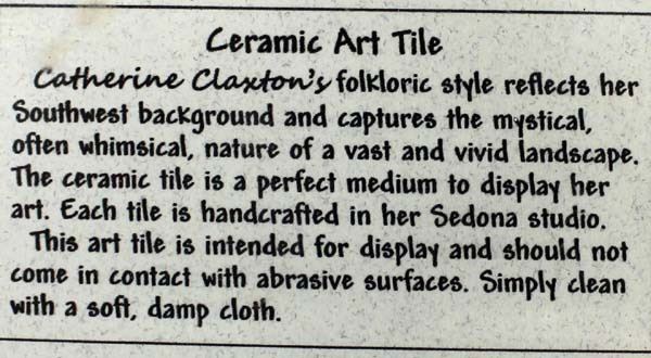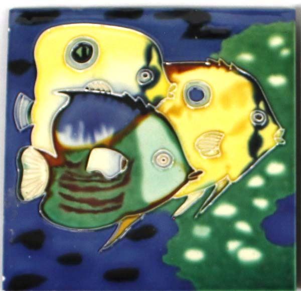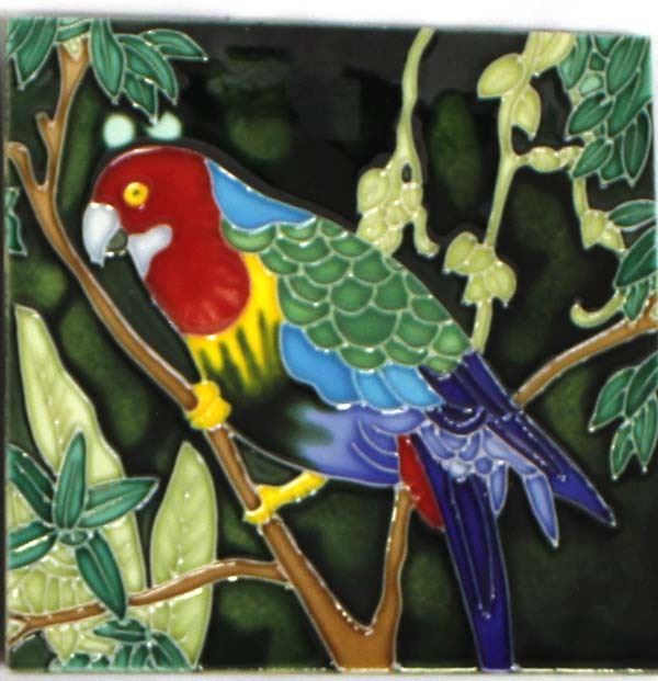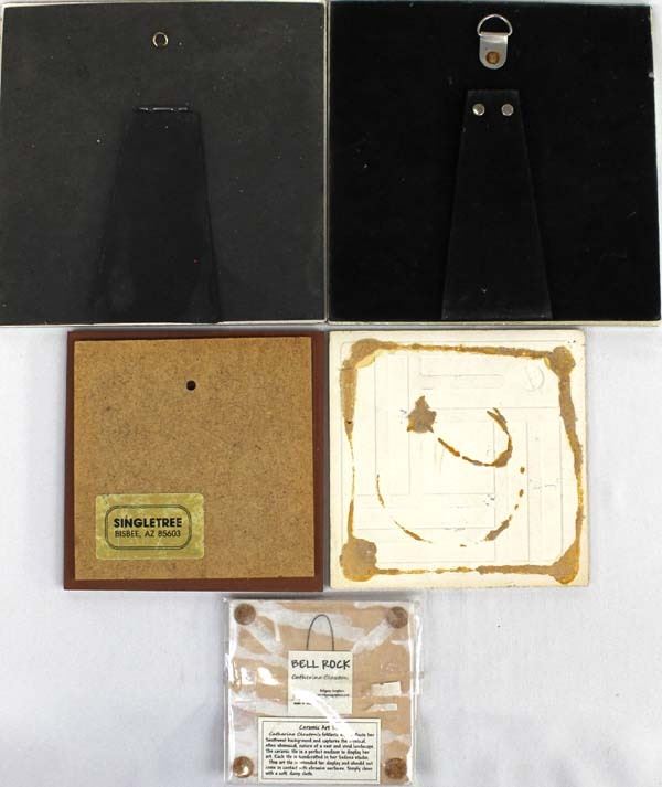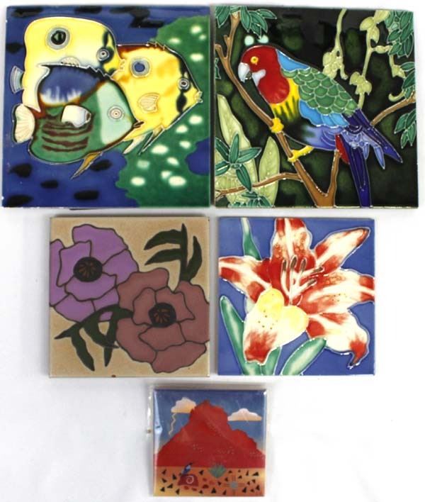 5 Assorted Tiles, includes 1. Bell Rock Ceramic Tile by Catherine Claxton, quail and desert landscape motif 2. Singletree Ceramic Tile, flower motif, does have a chip on the edge 3. Flower Ceramic Tile 4. Parrot Ceramic Tile 5. Fish Ceramic Tile, some chipping on edges, largest measures 8'' x 8''
