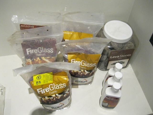 5 BAGS, 3 BROKEN LOOK FIREGLASS, 2 OF REFLECTIVE PLATINUM, LAVA STONES & 3 BOTTLES STOVE CL.EANER