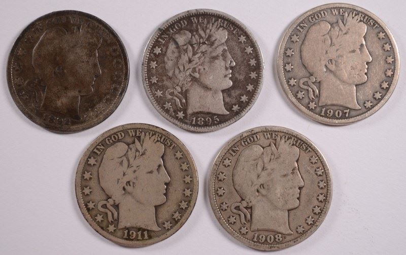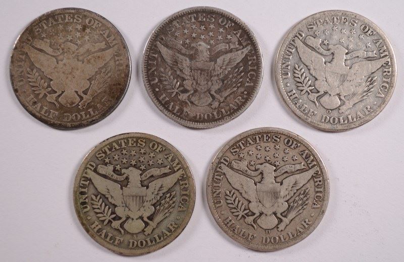 (5) BARBER HALF DOLLARS (1892, 1895, 1907-O, 1908-D, 1911-S)