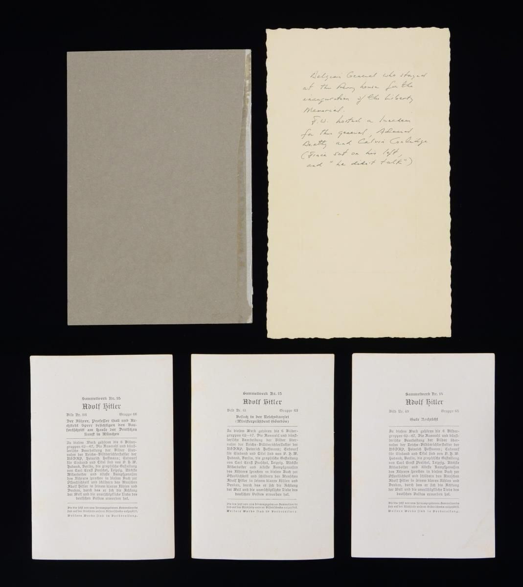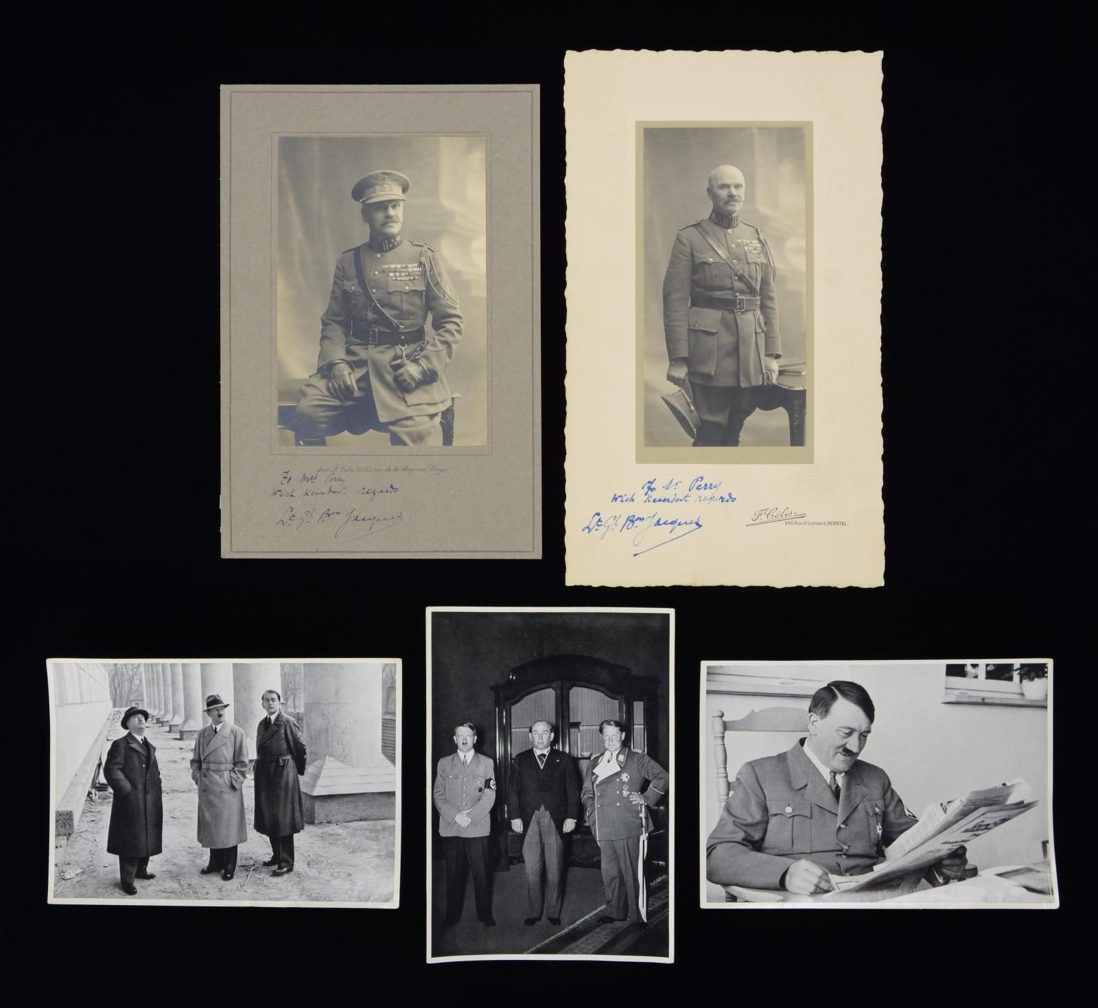 1) A large 9” x 6” autographed, carded photograph of Lieutenant General Baron Jules-Marie-Alphones Jacques de Dixmude in his service dress uniform. General Jacques, as he was commonly known, was a Belgian military figure in the Congo-Arab war, as well as WWI. He was an advocate of stern colonial rule and founded Albertville in the Congo. CONDITION: photo remains crisp with no damage or fading. 2) A large 10” x 6” autographed, carded photograph of Lieutenant General Baron Jules-Marie-Alphones Jacques de Dixmude is his service dress uniform. CONDITION: photo remains crisp with no damage or fading. 3,4,5) 3 Photographic copies relating to Adolf Hitler. This type of photograph was usually collected & pasted into large format books about Hitler and other aspects of the Third Reich. One photo depicts Hitler with Goring and another dignitary. Another depicts Hitler in uniform reading the morning paper. The third depicts Hitler in civilian clothing with 2 dignitaries. CONDITION: photos show very light wear. (02-20920/BF). $150-300.
