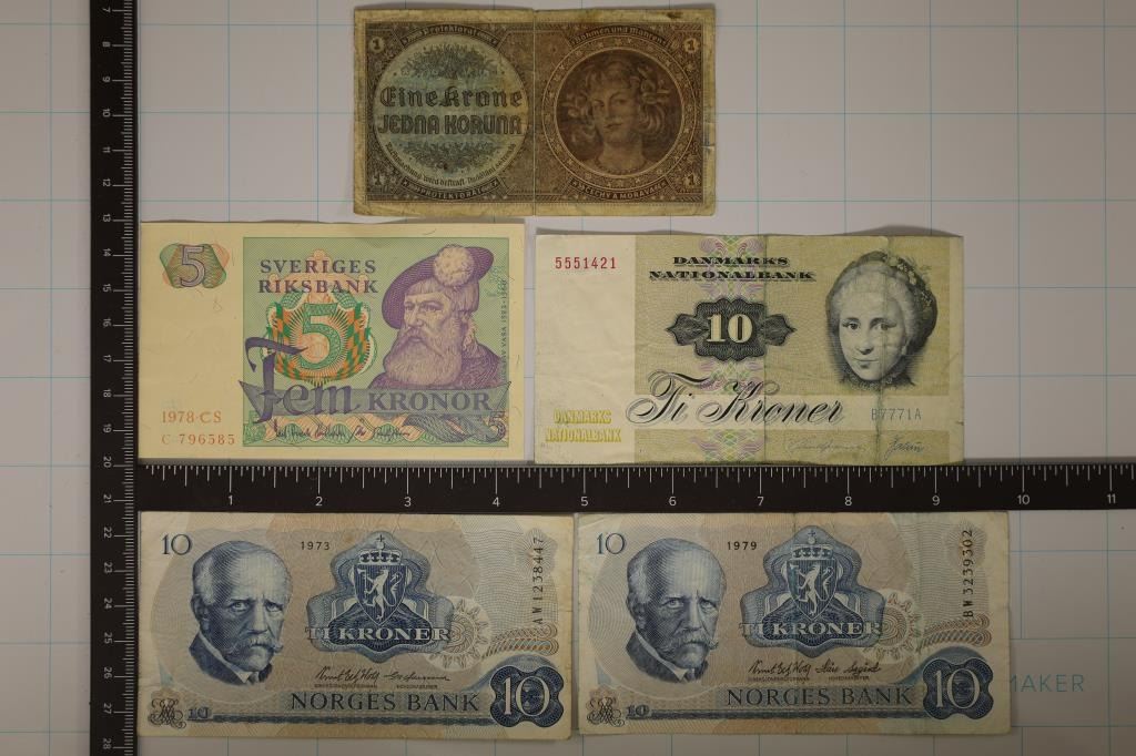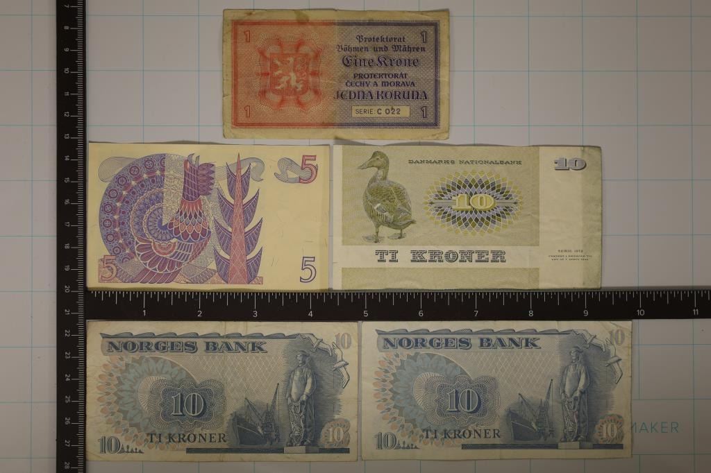 NORWAY. 1942 CZECH 1 KRONE, 1973 DENMARK 10 KRONER, 1965 SWEDEN 5 KRONOR AND 2-1972 NORWAY 10 KRONER