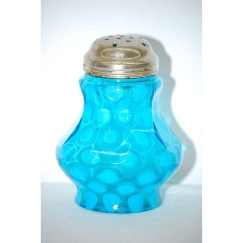 5" BLUE OPALESCENT VICTORIAN ART GLASS SUGAR SHAKER W/ THUMBPRINT PATTERN-NINE PANEL W/ TIN CAP - WEAR TO CAP