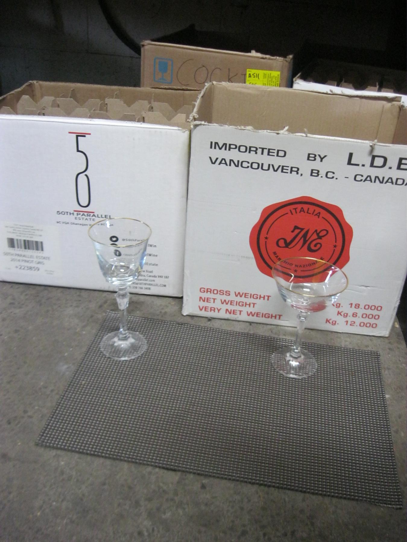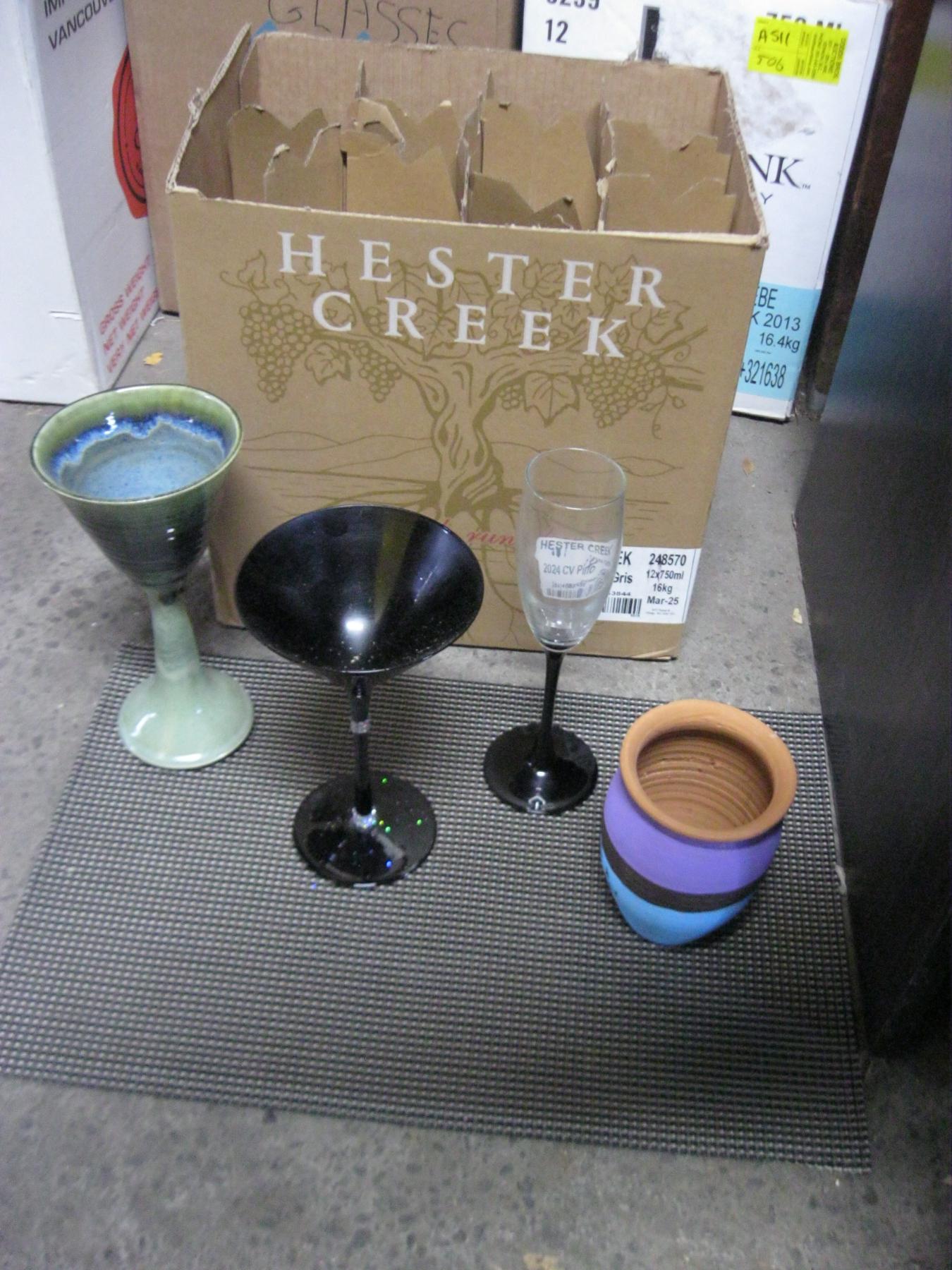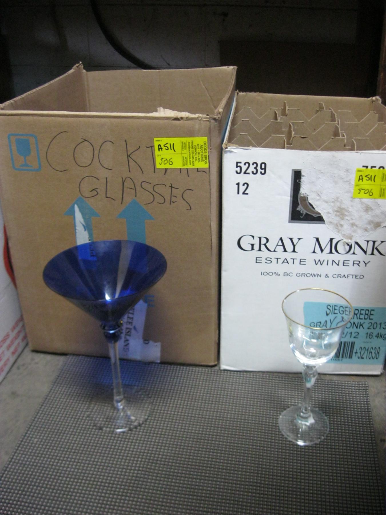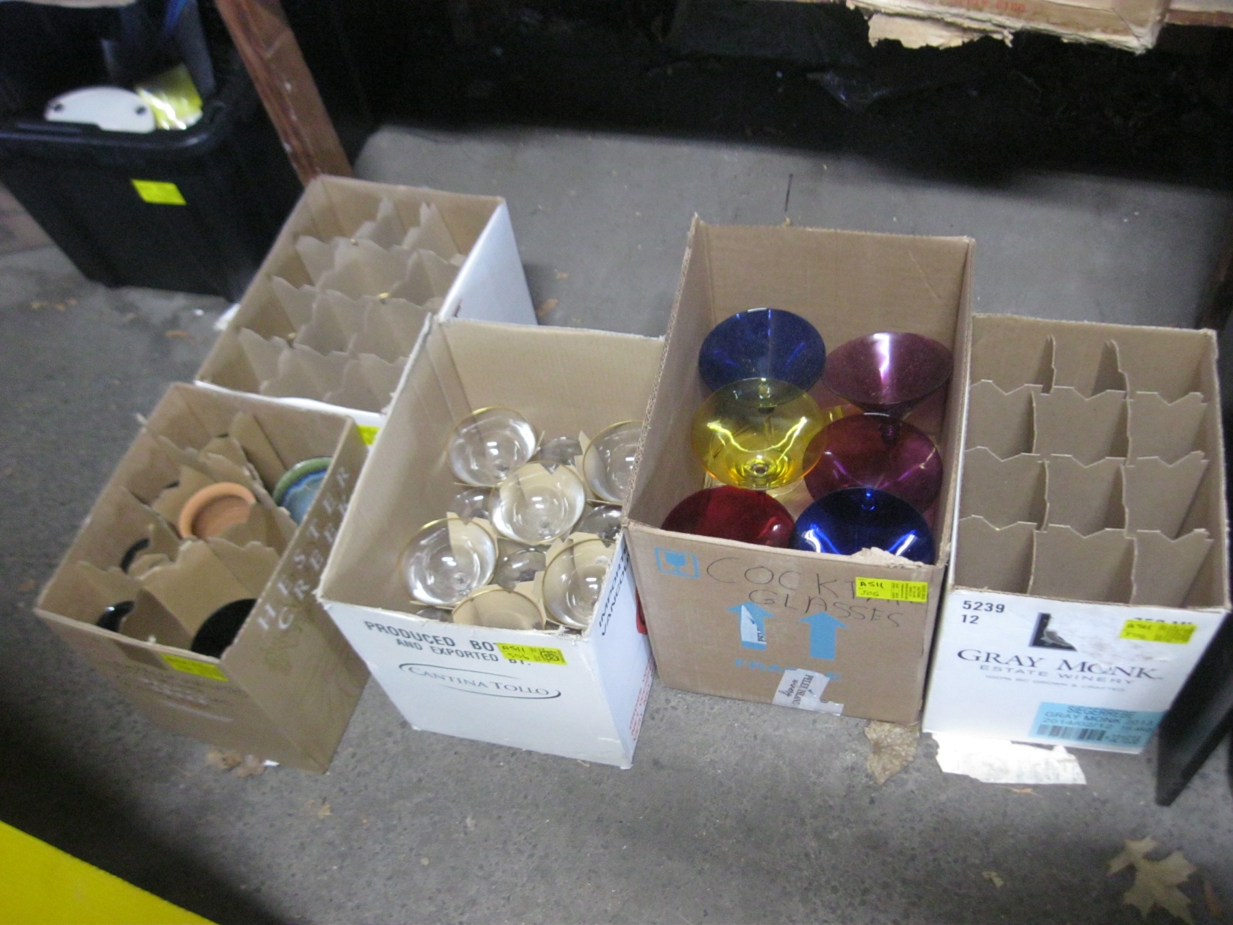 5 BOXES OF MISC. WINE GLASSES, POTTERY GLASSES