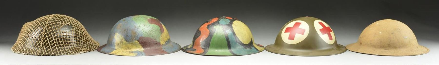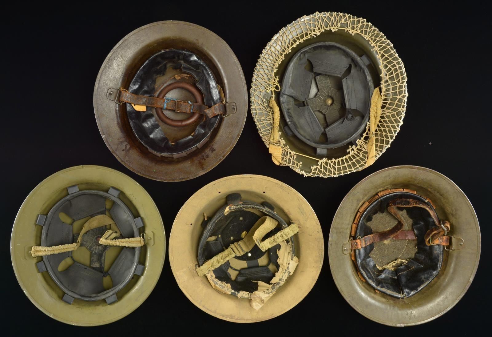 5) A British made helmet with dark green painted finish, black liner with khaki cotton web chinstrap with elastic ends. This helmet has a net covering enclosing a packaged field dressing on the left side. Helmet appears unissued. CONDITION: helmets show light to moderate wear except as noted. (02-16359/BF). $700-1,000.