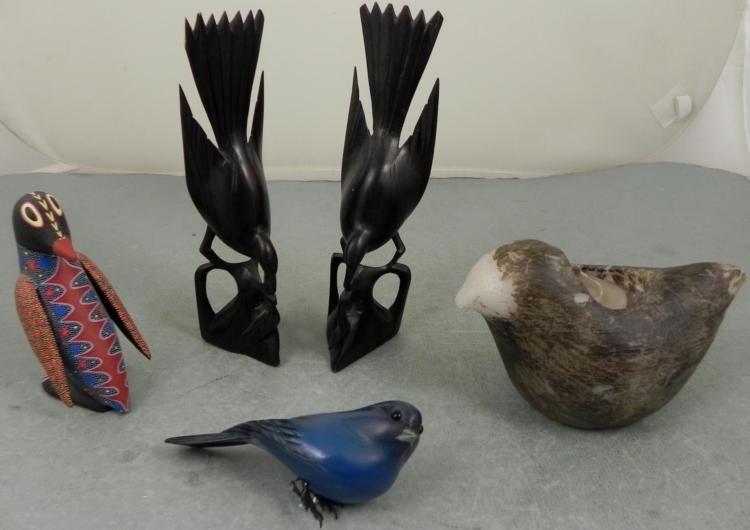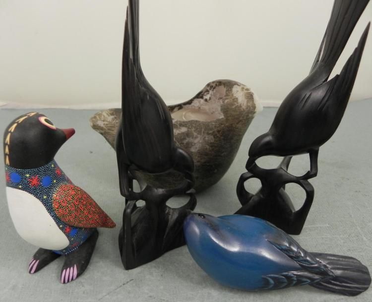 Here are four bird figurines, all nicely made. Two matching birds are carved from dark stained wood. The bluebird is hand-painted wood, with wire feet. The nicely detailed painted penguin is from Juan Carlos Santiago Arrazola. The candle is gray and white and partly used, but still charming. The others are in very good condition. These measure up to 7 3/4" tall. Invite these in to any bird collection.