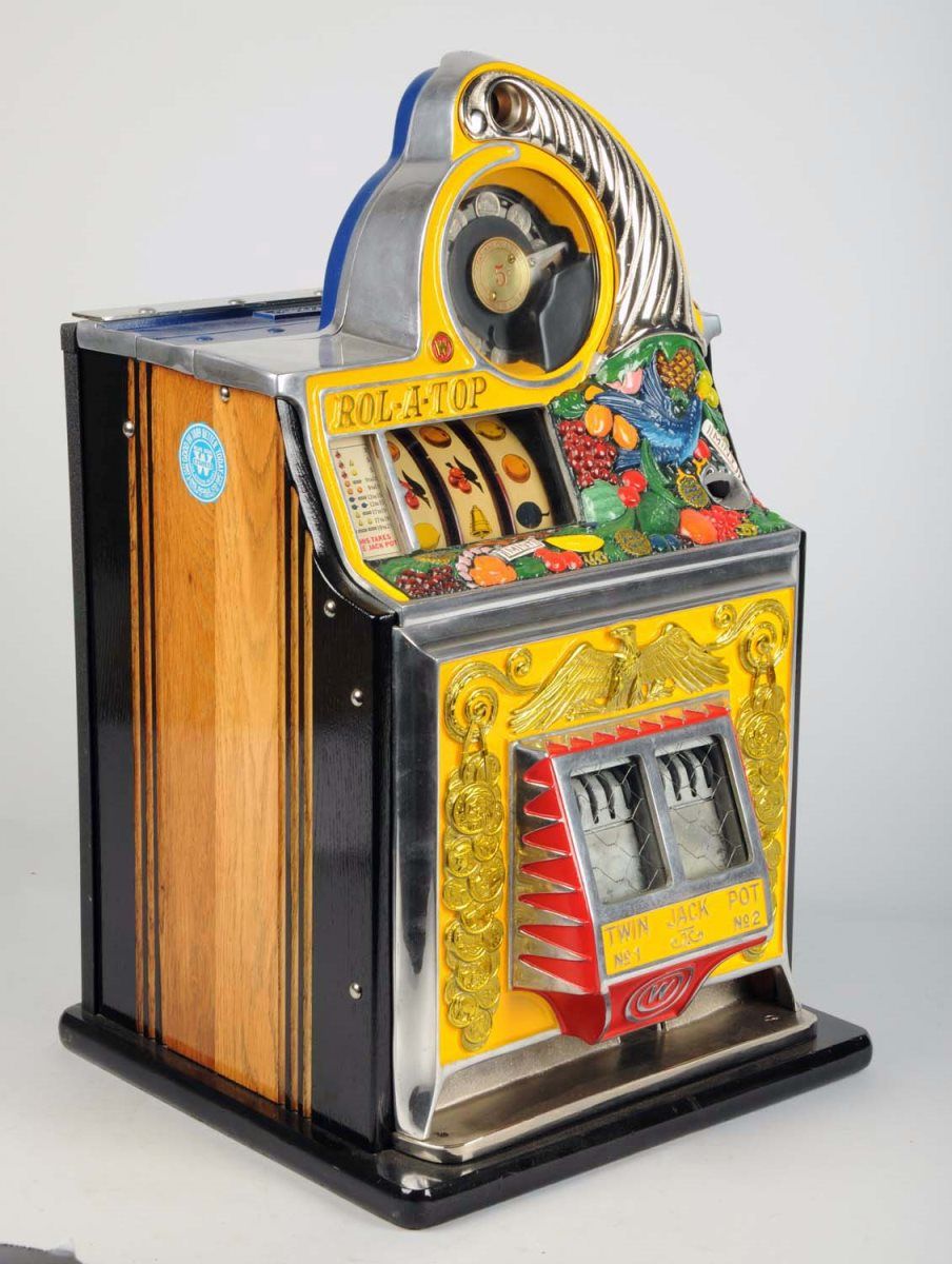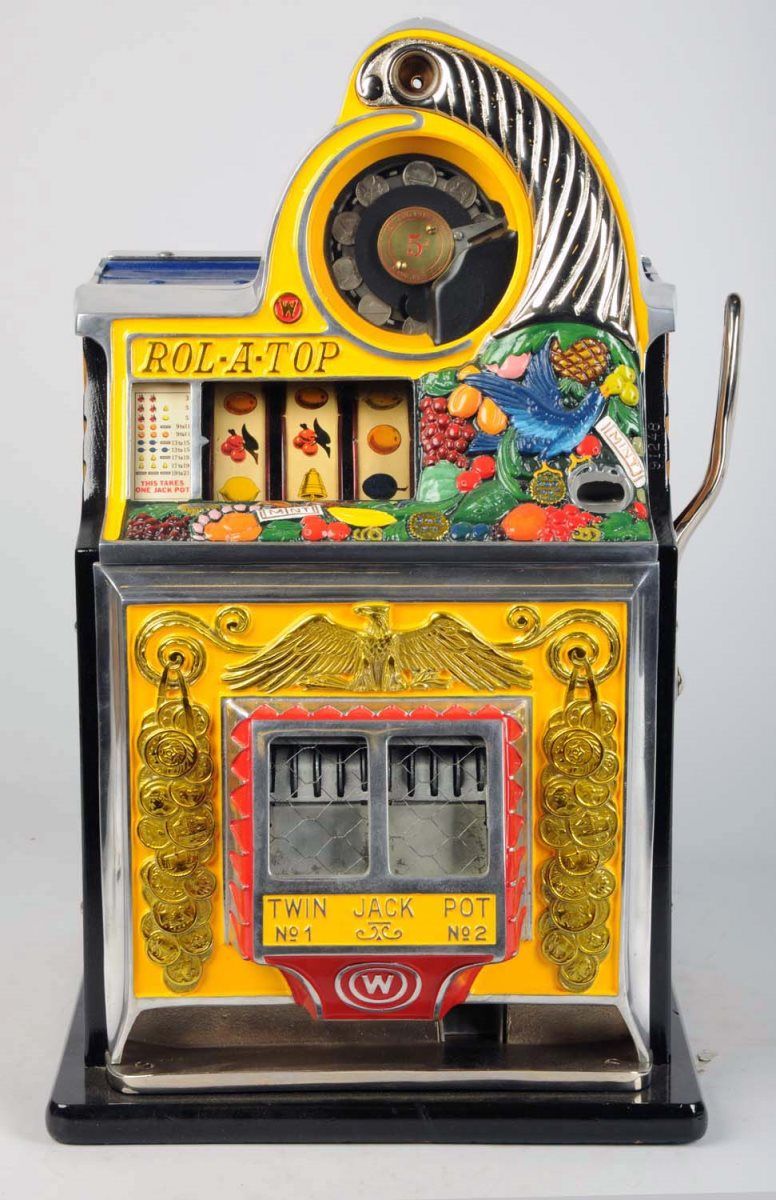 5 ¢ Watling Bird Of Paradise Rol-A-Top Twin Jackpot Front Vendor Escalator Bell Slot Machine c1935, Restored by Fred DeBaugh, Works - plays & pays w/ keys Condition (Very good). Size 26" T.