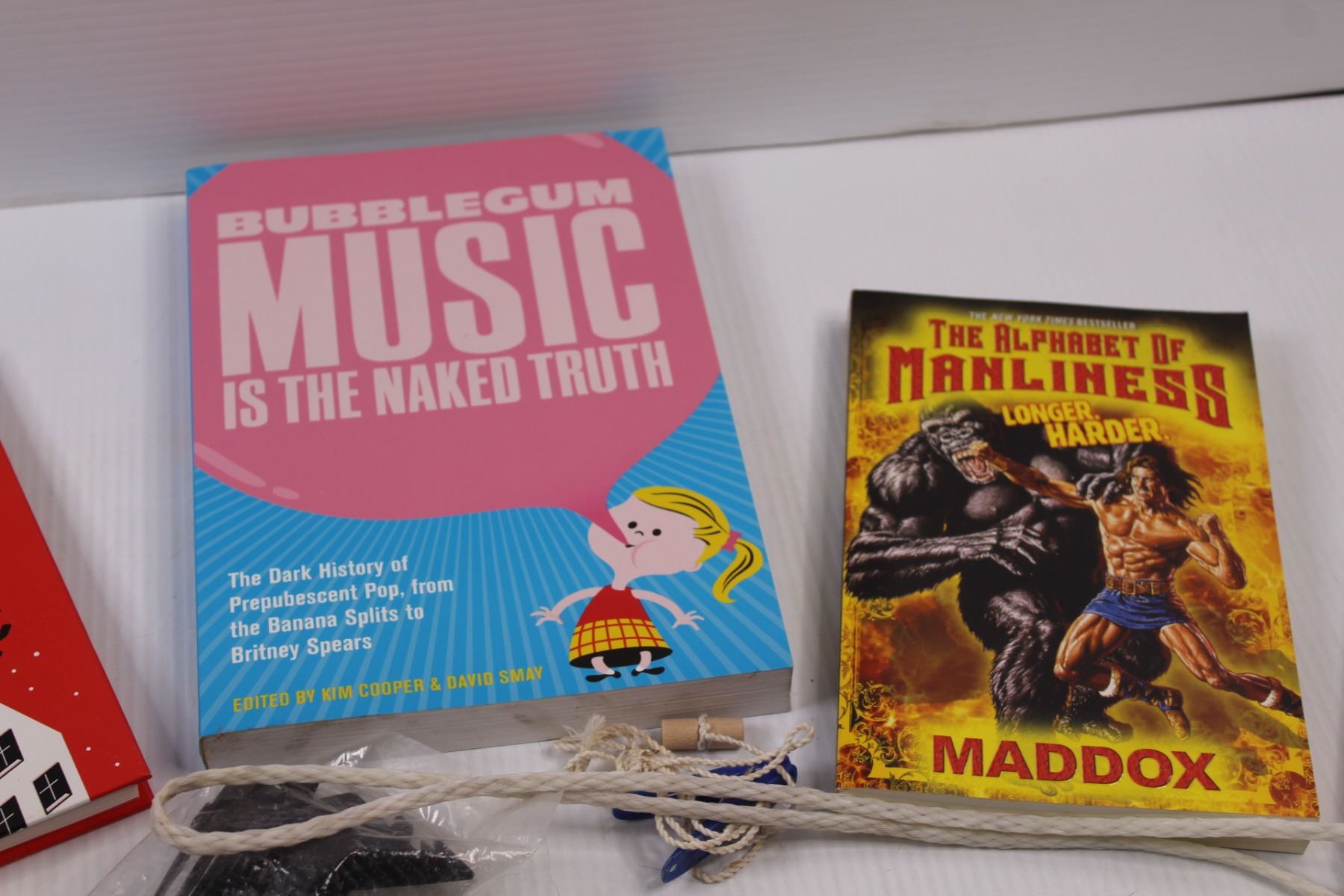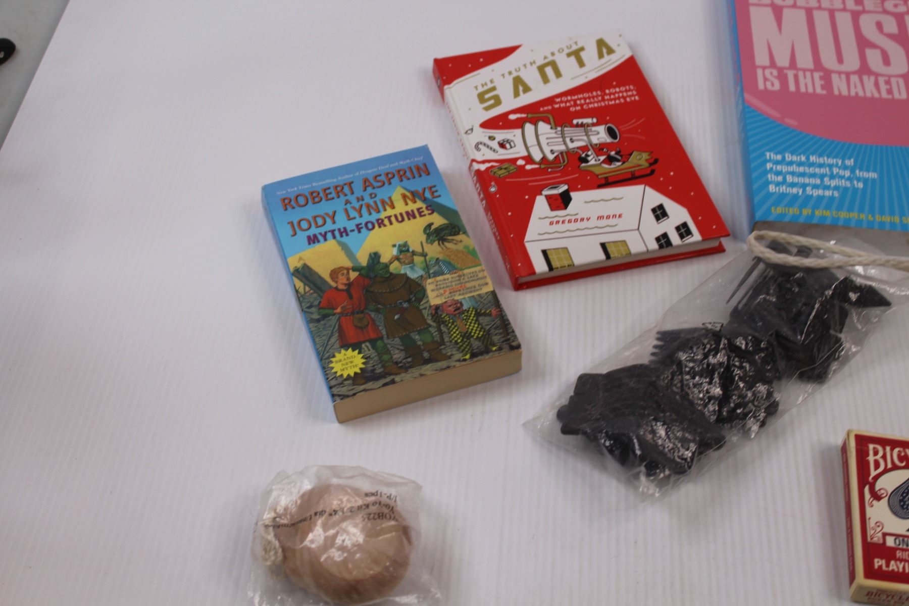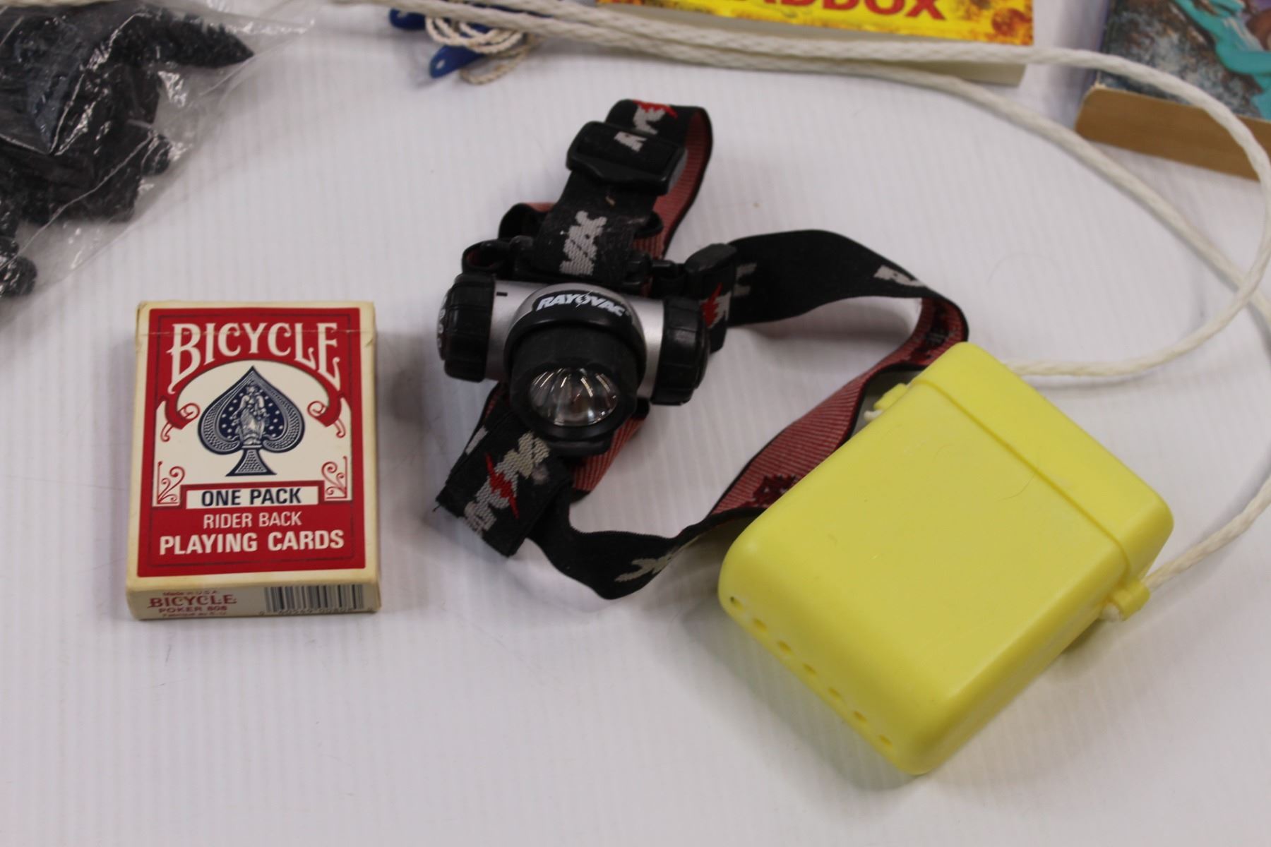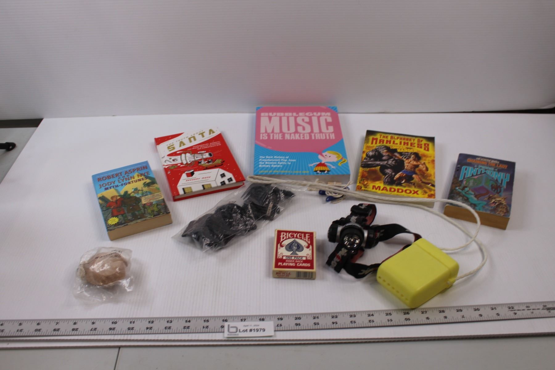 (5) Books of Varying Subject Matter, Hair Clipper Combs of Varying Sizes, Used Playing Cards, Head Lamp, Yo-Yo Kit & Soap Bar Container on a Rope