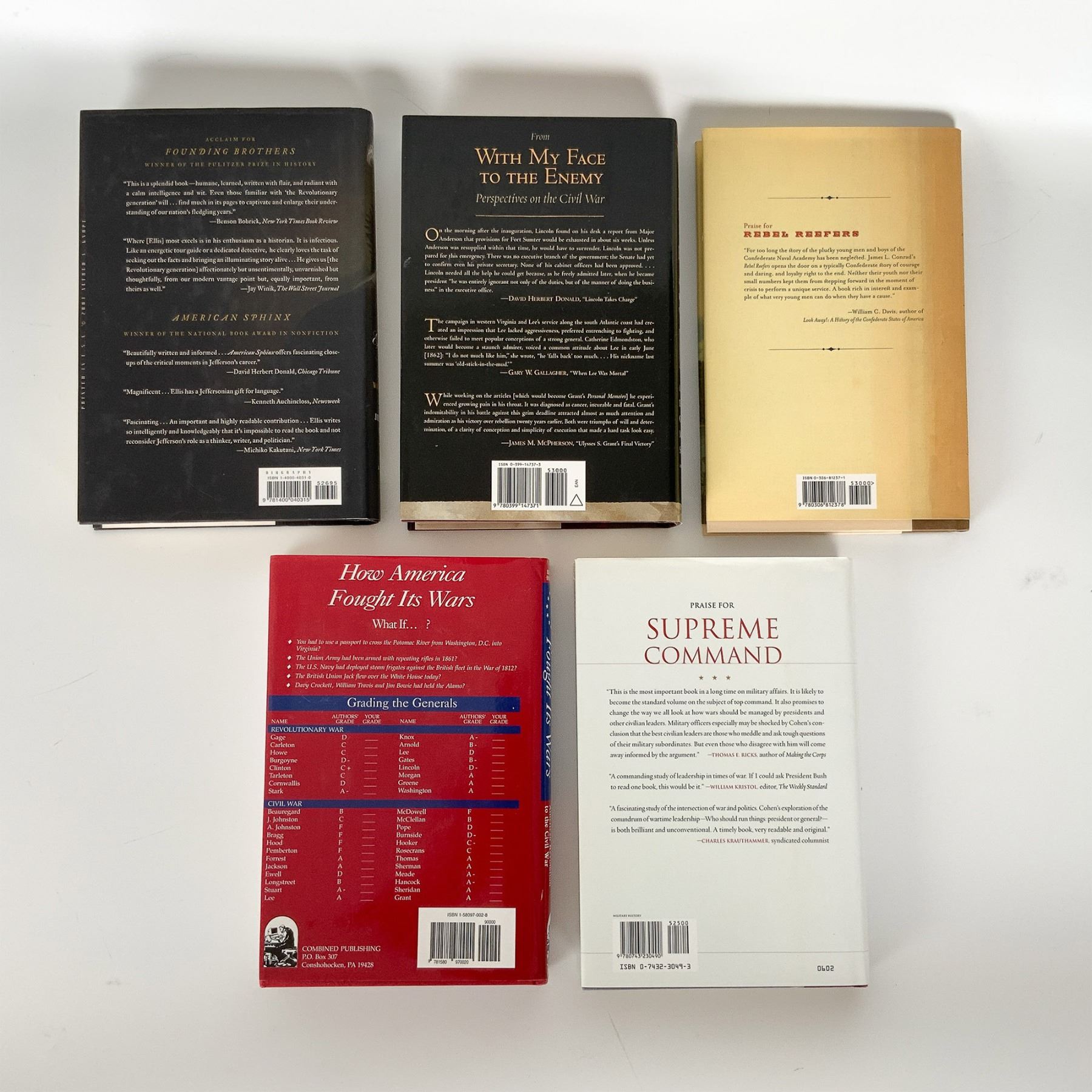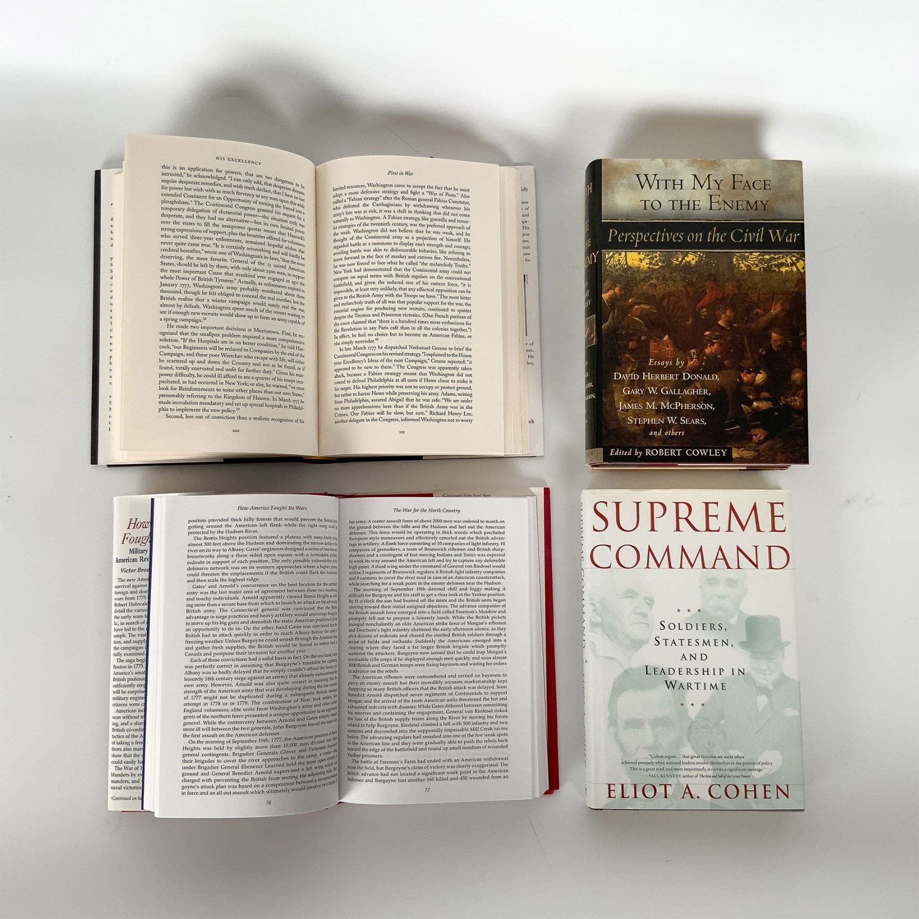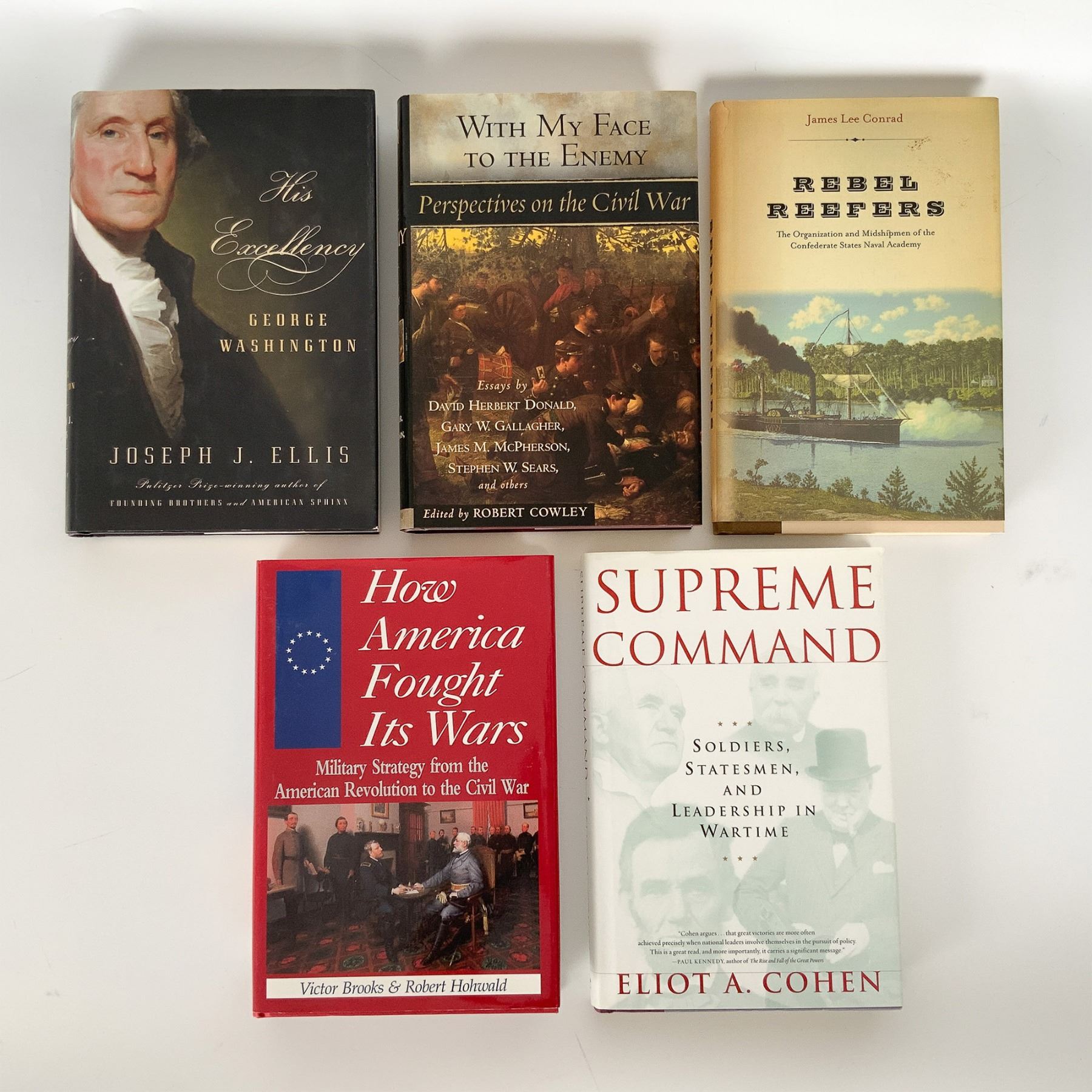 This collection of five books explores various aspects of American military history, leadership, and strategy, spanning conflicts from the American Revolution to the Civil War. Included in this lot are His Excellency: George Washington by Joseph J. Ellis, a compelling biography of the first U.S. president and his military leadership; With My Face to the Enemy, edited by Robert Cowley, an anthology of essays on the Civil War from notable historians; Supreme Command by Eliot A. Cohen, which examines how political leaders have directed military strategy in wartime; How America Fought Its Wars, an analysis of U.S. military strategy from the Revolution to the Civil War; and Rebel Reefers by William N. Conrad, detailing the Confederate States Navy and its operations. These books offer insightful perspectives on military decision-making, battlefield tactics, and the broader impact of war on American history. A valuable addition for historians, military enthusiasts, and collectors of historical literature.