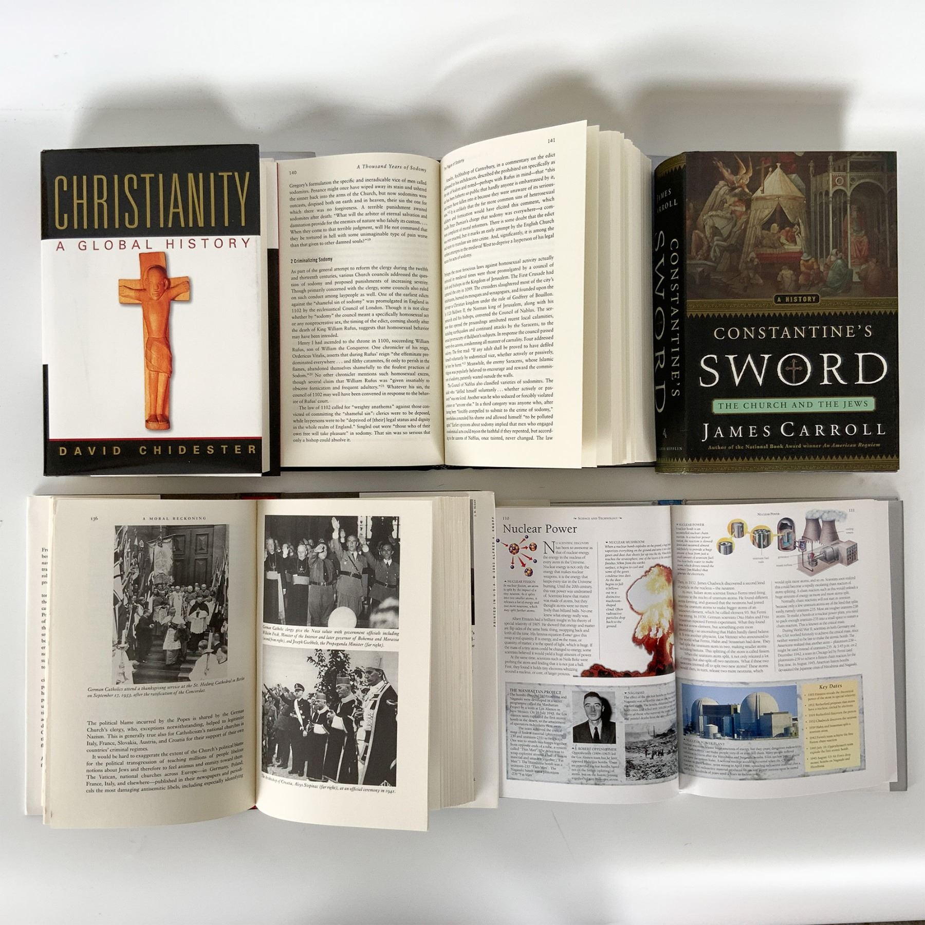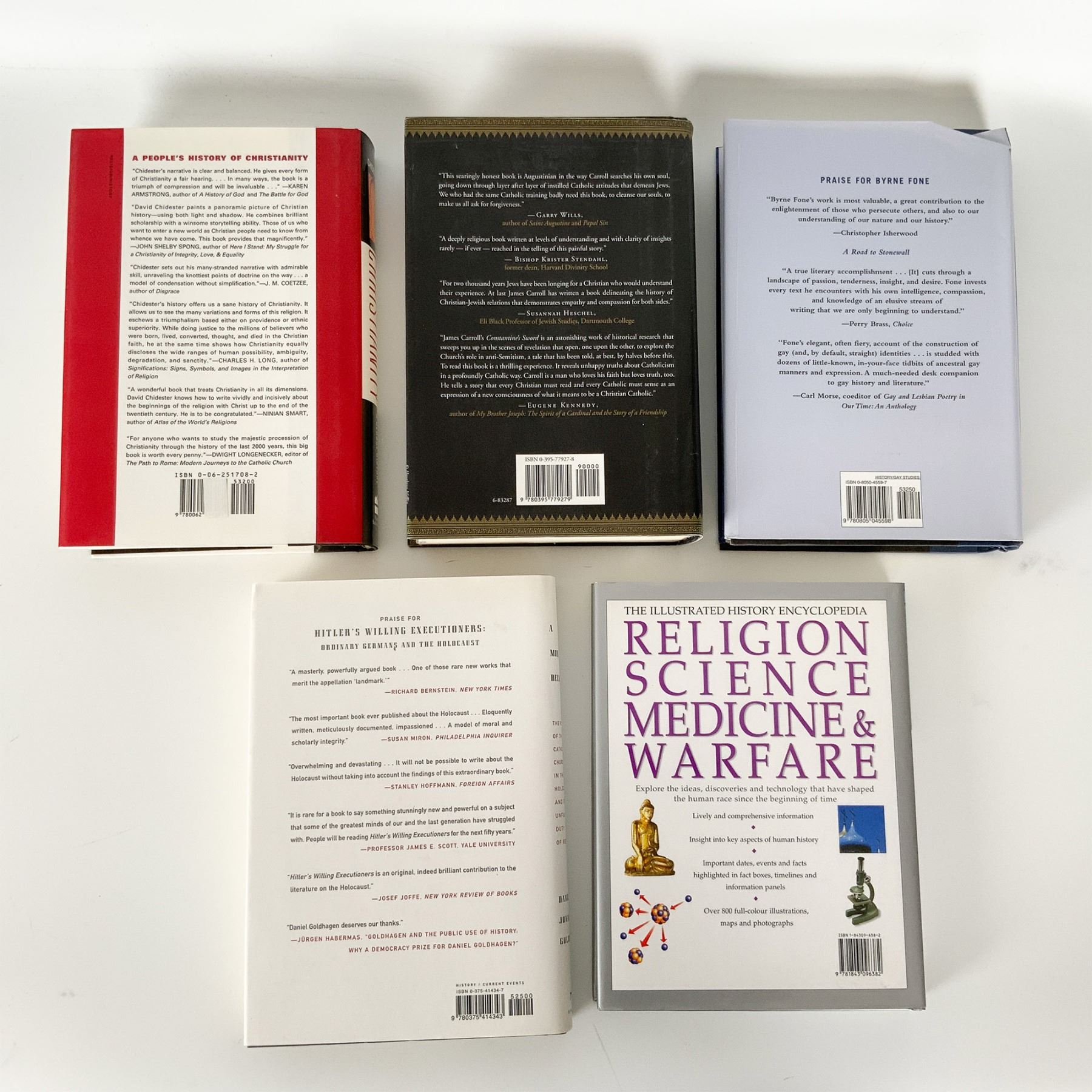 Collection of five hardcover books explores the intersections of religion, history, and societal issues, offering a deep dive into topics such as Christianity's global history, religious warfare, and social challenges related to faith. Titles include Christianity: A Global History by Chidester, Constantine's Sword by James Carroll, Homophobia by Byrne Fone, A Moral Reckoning by Daniel Jonah Goldhagen, and Religion, Science, Medicine & Warfare by Farndon, Adams, and Ward. These volumes provide scholarly perspectives on the historical impact of Christianity, the Catholic Church's role in the Holocaust, the cultural roots of homophobia, and the broader relationship between religion and warfare. A valuable addition to any academic, theological, or history-focused collection.