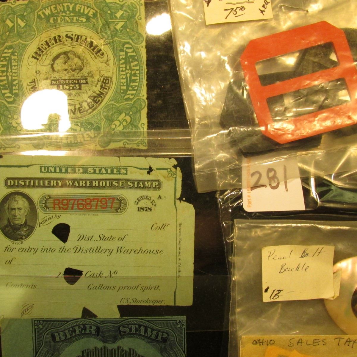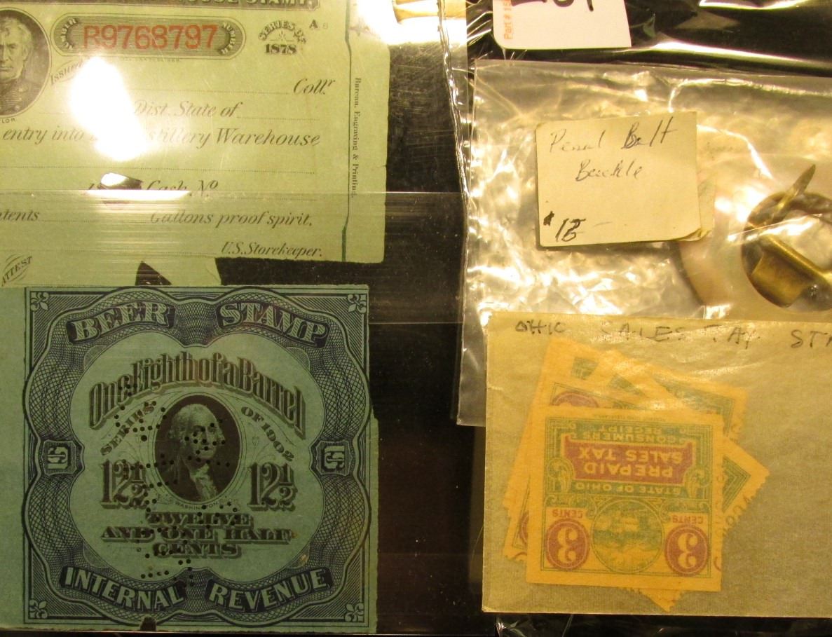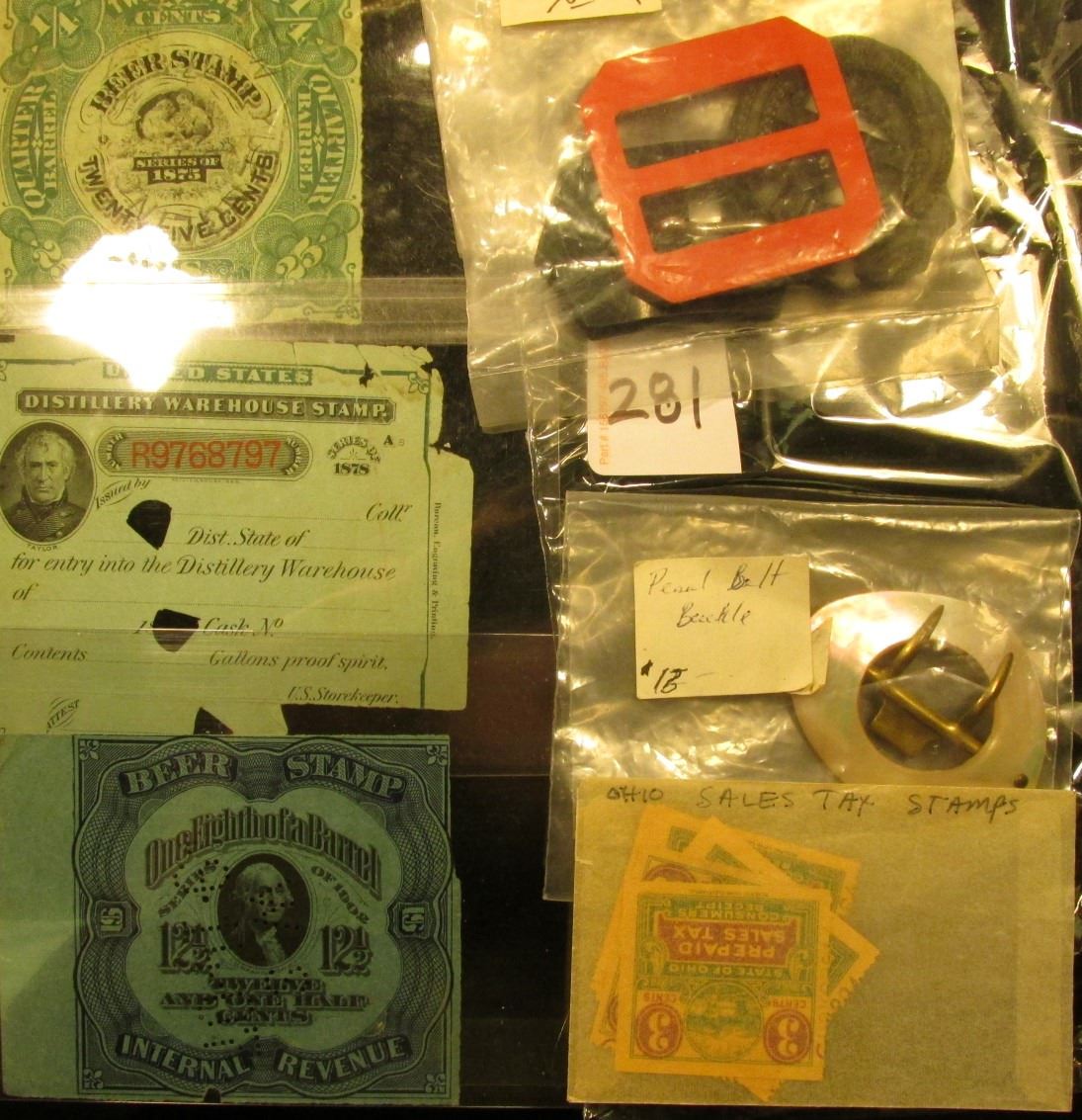 (5) Buckles including one of Mother-of-pearl; several Ohio Sales Tax Stamps; Series of 1875 Twenty-Five Cent U.S. Inter. Rev. Beer Stamp; Series of 1879 U.S. Distillery Warehouse Stamp; & Series 1902 Beer Stamp 12 1/2c "One Eighth of a Barrel".