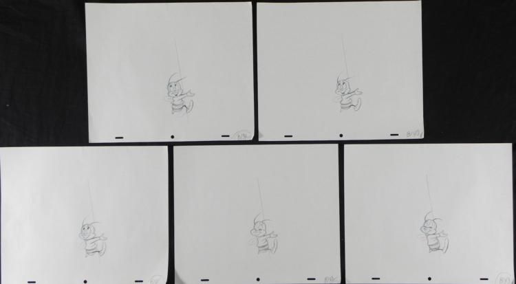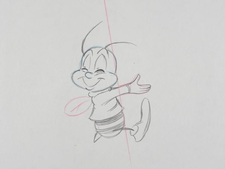 Buzz holding onto Cheerios box5 Original Animation DrawingsDetails: Animation notations and peg holesOriginal "rough" animation drawing, in black pencilSize of drawing: 10 1/2 x 12 1/2 inchesCondition: Very goodTraditional animation is a multi-step proce
