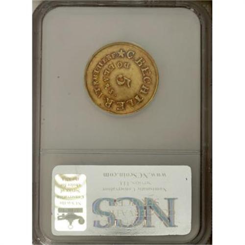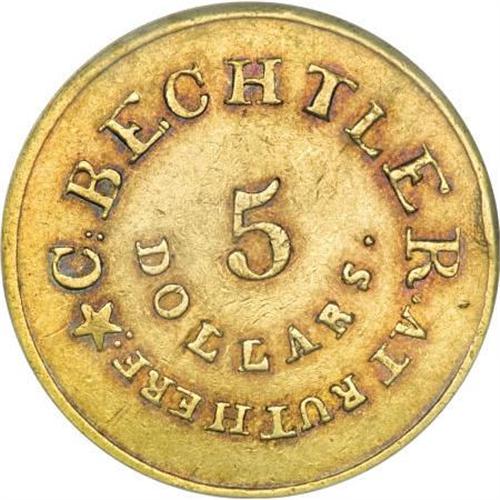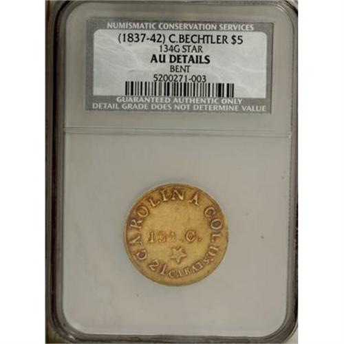 <B>(1837-42) $5 C. Bechtler Five Dollar, 134G, With Star--Bent--NCS. AU Details.</B></I> K-20, R.4. Wavy near the HTL in BECHTLER, perhaps due to a small bruise near the R in BECHTLER. Cherry-red and electric-blue toning visits protected areas, while the open fields are olive-gold. The dies are rotated 90 degrees clockwise from coin turn. Listed on page 350 of the 2008 <I>Guide Book.</B></I><BR><BR><b>Shipping:</b> Coins & Currency (<a target="_blank" href="http://www.heritageauctions.com/common/shipping.php">view shipping information</a>)
