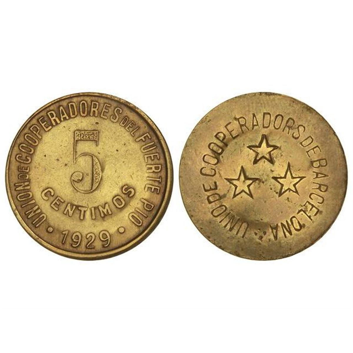 COOPERATIVE AND ADVERTISING TOKENS - 5 Céntimos. - 1929. - UNIÓN DE COOPERADORES DEL FUERTE PÍO. BARCELONA. - Rev.: U.C.B. Latón. Ø 25 mm. RARA. L-1614. MBC. - -
