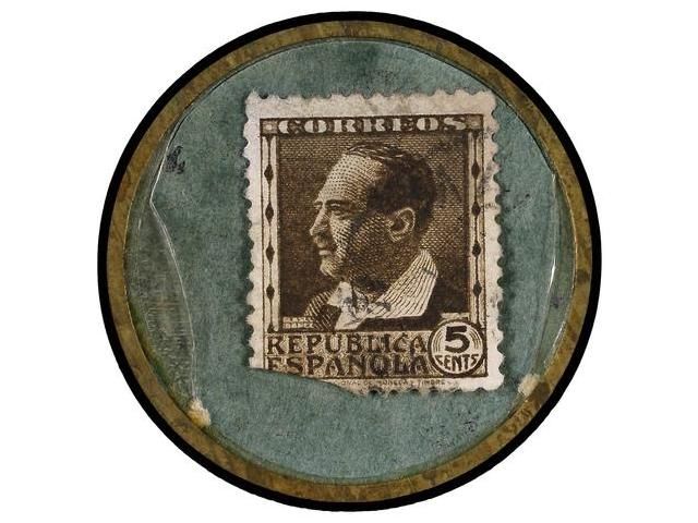 5 Céntimos. Emisión de postguerra. CAFÉ RESTAURANTE SUIZO. CAFÉ RESTAURANTE CALIFORNIA. Disco de cartulina con sello de 5 Céntimos Blasco Ibáñez al dorso. (Celuloide protector roto, manchas de tinta azul en anverso). MUY RARO. L-No cat. (MBC).