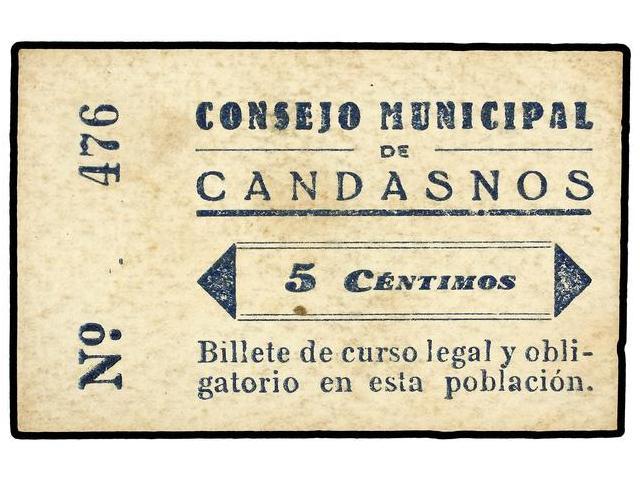 5 Céntimos. S/F. C.M. de CANDASNOS (Huesca). Cartón. (Algo sucio). MUY RARO. Mont-432/A. EBC.
