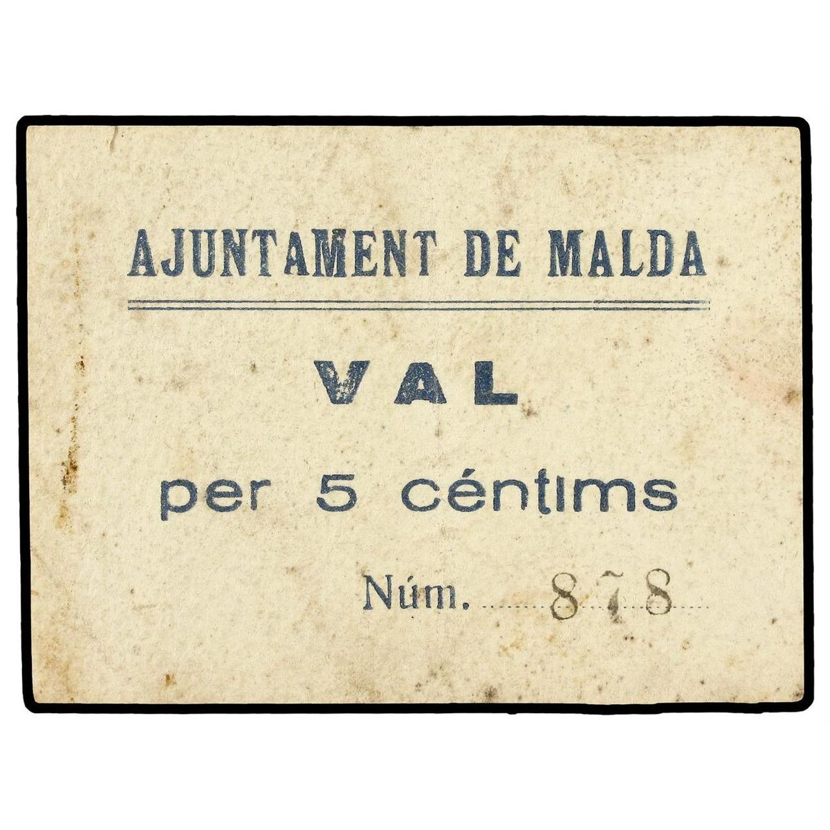 5 Cèntims. - Aj. de MALDA. - Acento agudo en Céntims. MUY RARO. AT-1404a; T-1602. MBC. - -
