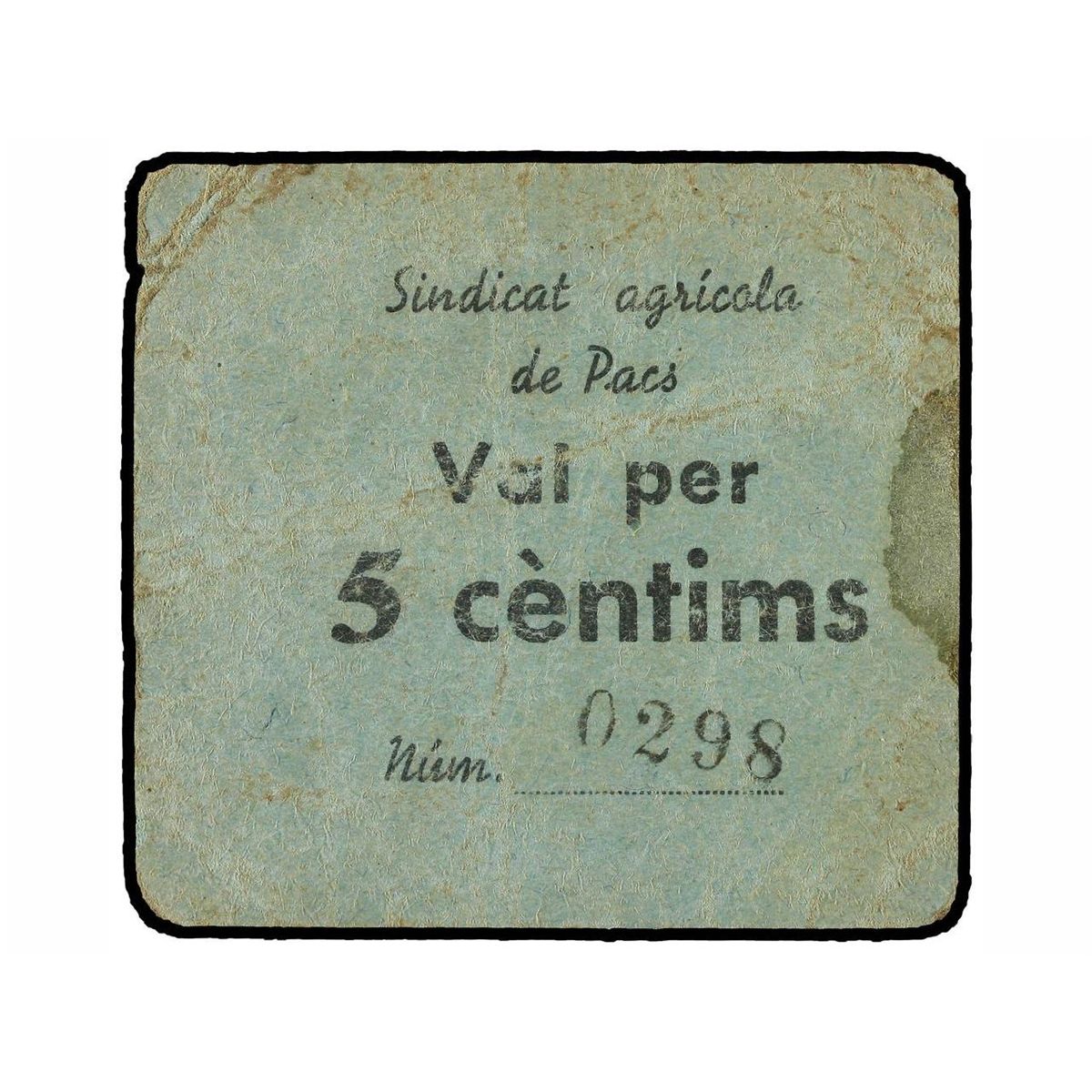 5 Cèntims. - PACS. SINDICAT AGRÍCOLA. - Cartón. (Mancha). MUY RARO. T-1990. MBC. - -