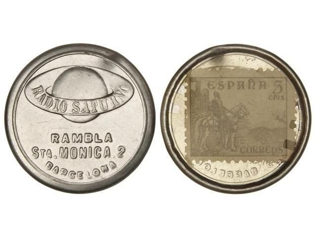 5 Cétnimos. Emisión de Postguerra. RADIO SATURNO BARCELONA. Disco de aluminio con sello de correos de 5 cts. del Cid al dorso. (Golpe en canto). MUY RARO. L-No cat. este valor (1400). EBC-.