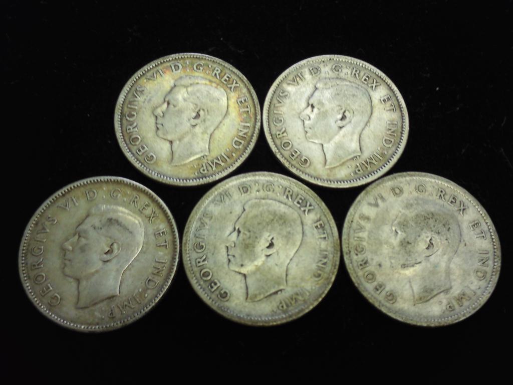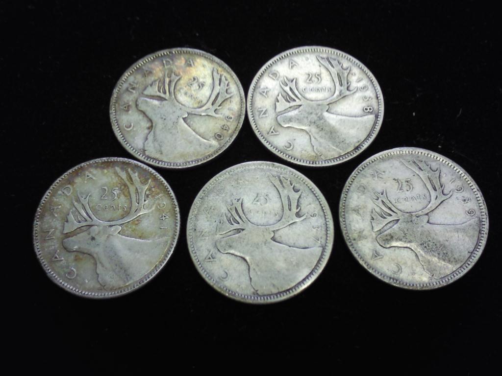 5-CANADA SILVER QUARTERS 1937,38,39,40 & 41