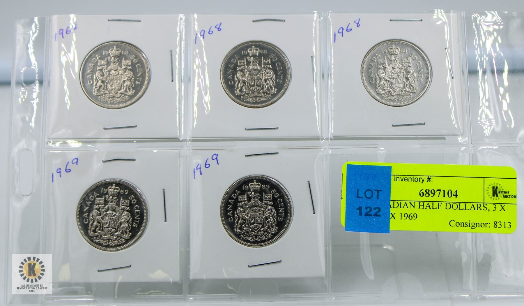 5 CANADIAN HALF DOLLARS, 3 X 1968, 2 X 1969
