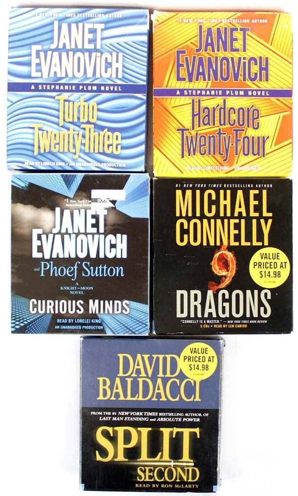 5 CD Collection of Audio Books, Authors include Janet Evanovich, Michael Connelly and David Baldacci.