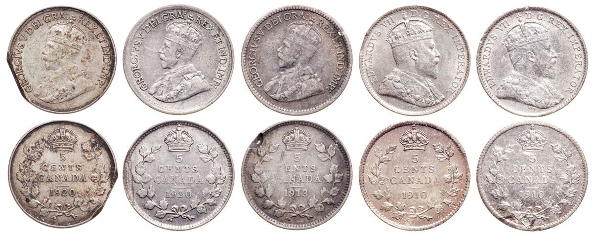 Lot of error 5 cent silvers, including clips, struck through debris and defective planchet. 2x Edward VII are AU/Unc, 3x George V are VF-EF. Lot of Five (5) pcs.