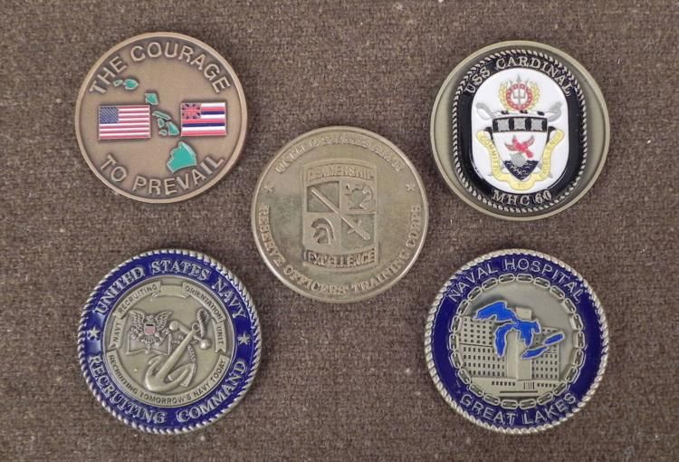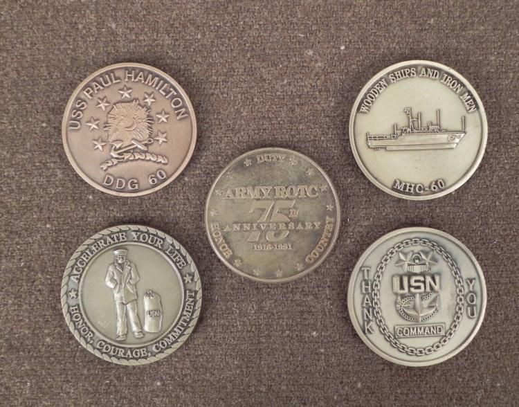 5 CHALLENGE COINS--4 NAVY--1 ARMY-HIGH QUALITY INCLUDED: NAVY, RECRUITING COMMAND--NAVY COMMAND,GREAT LAKES NAVAL HOSPITAL--USS CARDINAL MHC60, --USS PAUL HAMILTON DDG 60--75th ARMY ROTC ANNIVERSARY