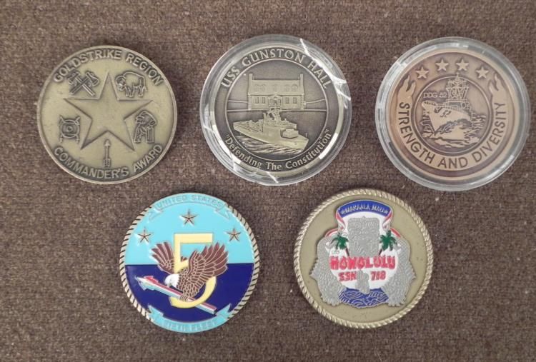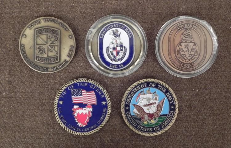 5 CHALLENGE COINS-ARMY & NAVY-TOP QUALITY * * INCLUDED: ARMY ROTC--HONOLULU SSH 718--NAVY 5TH FLEET NAVY CENTRAL COMMAND--USS GUNSTON HALL--NAVY USS BARRY DDG52 *