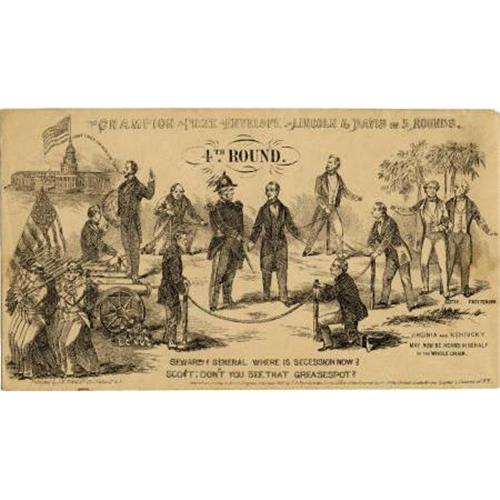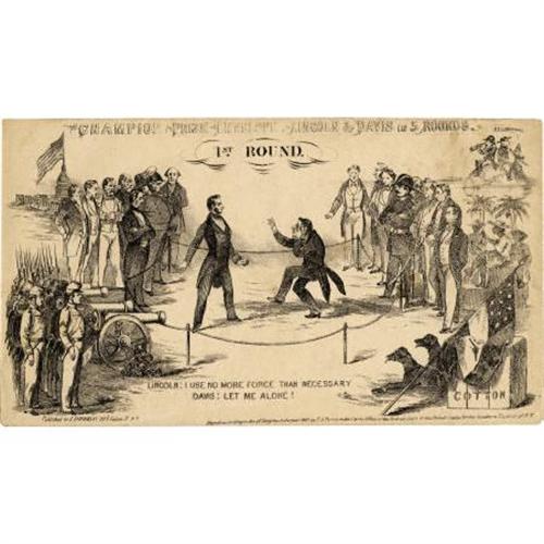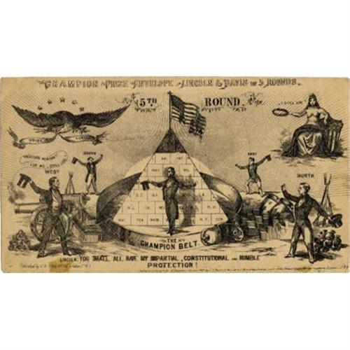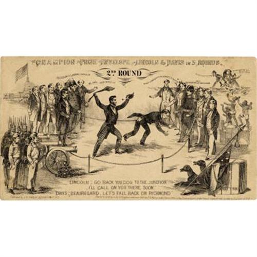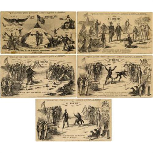 <B>COMPLETE SET "CHAMPION PRIZE ENVELOPES - LINCOLN & DAVIS IN 5 ROUNDS" 1861.</B></I> Only edition of this set. There could only be a few complete sets of these envelopes know, individually they are very rare. Each of these five envelopes represents one round of the Champion prize round. The sub-titles have descriptions of all five events. The series start with Lincoln and Davis in the ring with Union Soldiers on one side & Confederates opposite. The progress through Lincoln tearing pieces of Davis' suit off, putting Davis in head lock, to the Champion belt subtitle, “You shall all have my impartial, constitutional and humble protection”. Published by J. H. Tingley, New York.<BR><BR><B>Provenance: </B></I><I>Al. Emmett Fostell Collection</B></I><BR><BR><B>Condition:</B></I> Very minor discoloration, No. 5 cover has spot, bottom left. Overall condition fine-very fine.<BR><BR><b>Shipping:</b> Miscellaneous Collectibles, Smal (<a target="_blank" href="http://www.heritageauctions.com/common/shipping.php">view shipping information</a>)