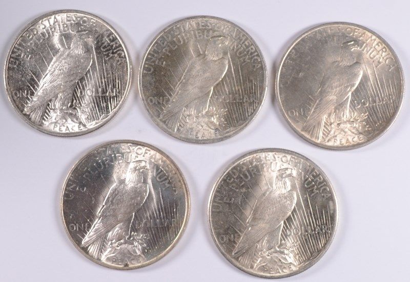 ( 5 ) CHOICE BU PEACE SILVER DOLLARS: 1922, 1923, ( 2 ) 1924 AND 1925