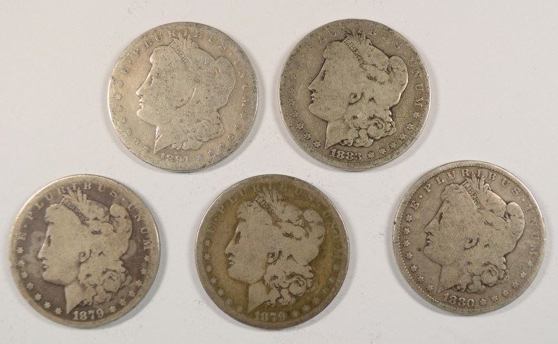 ( 5 ) CIRC MORGAN SILVER DOLLARS: ( 2 ) 1879, 80, 83 & 1891-S