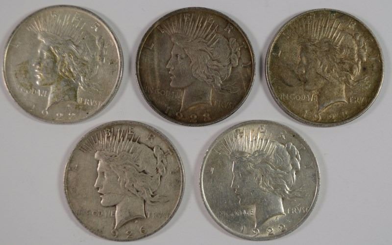 ( 5 ) CIRCULATED PEACE DOLLARS: 1922, 1922-D, 1923, 1923-D & 1926-D