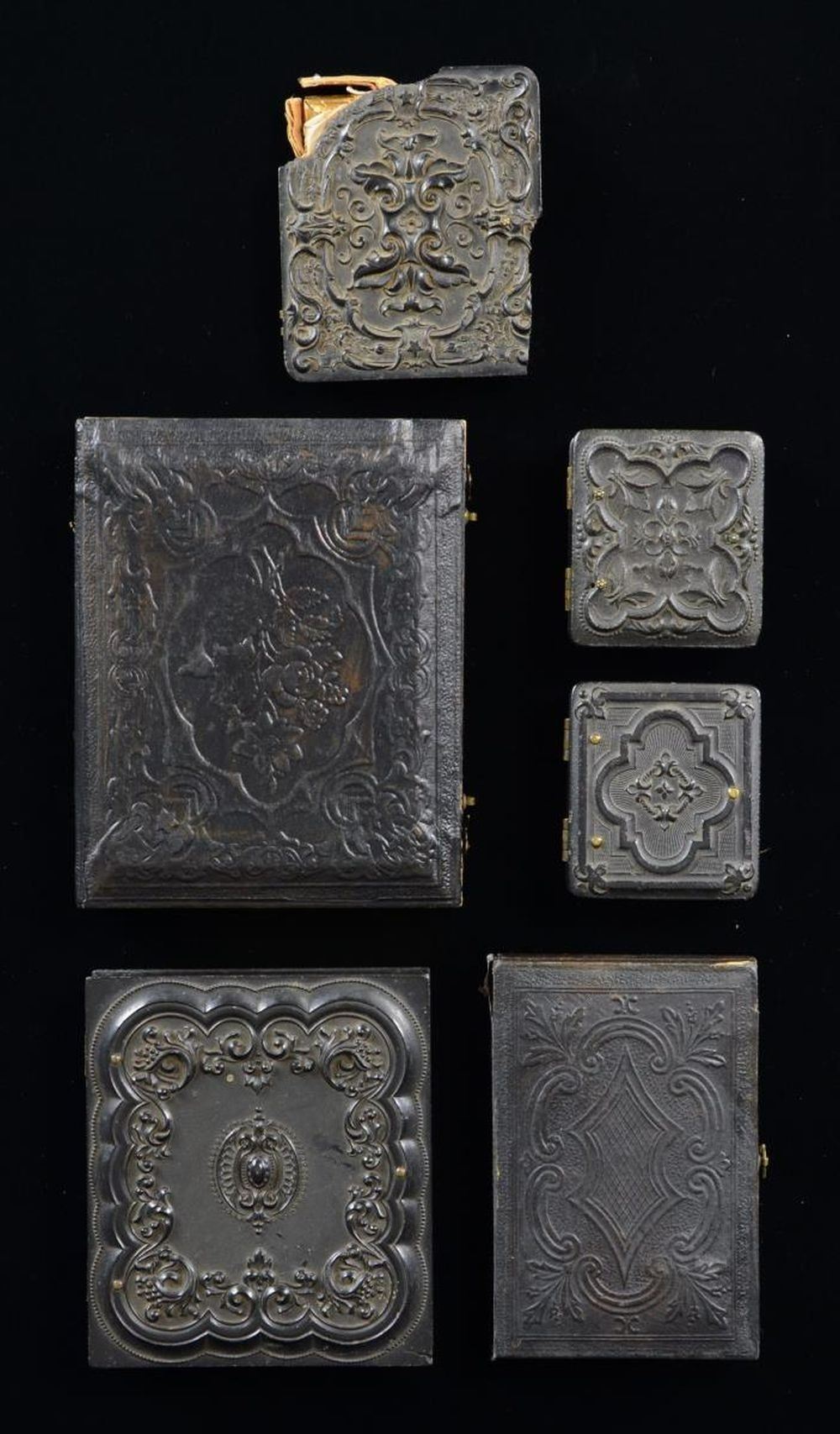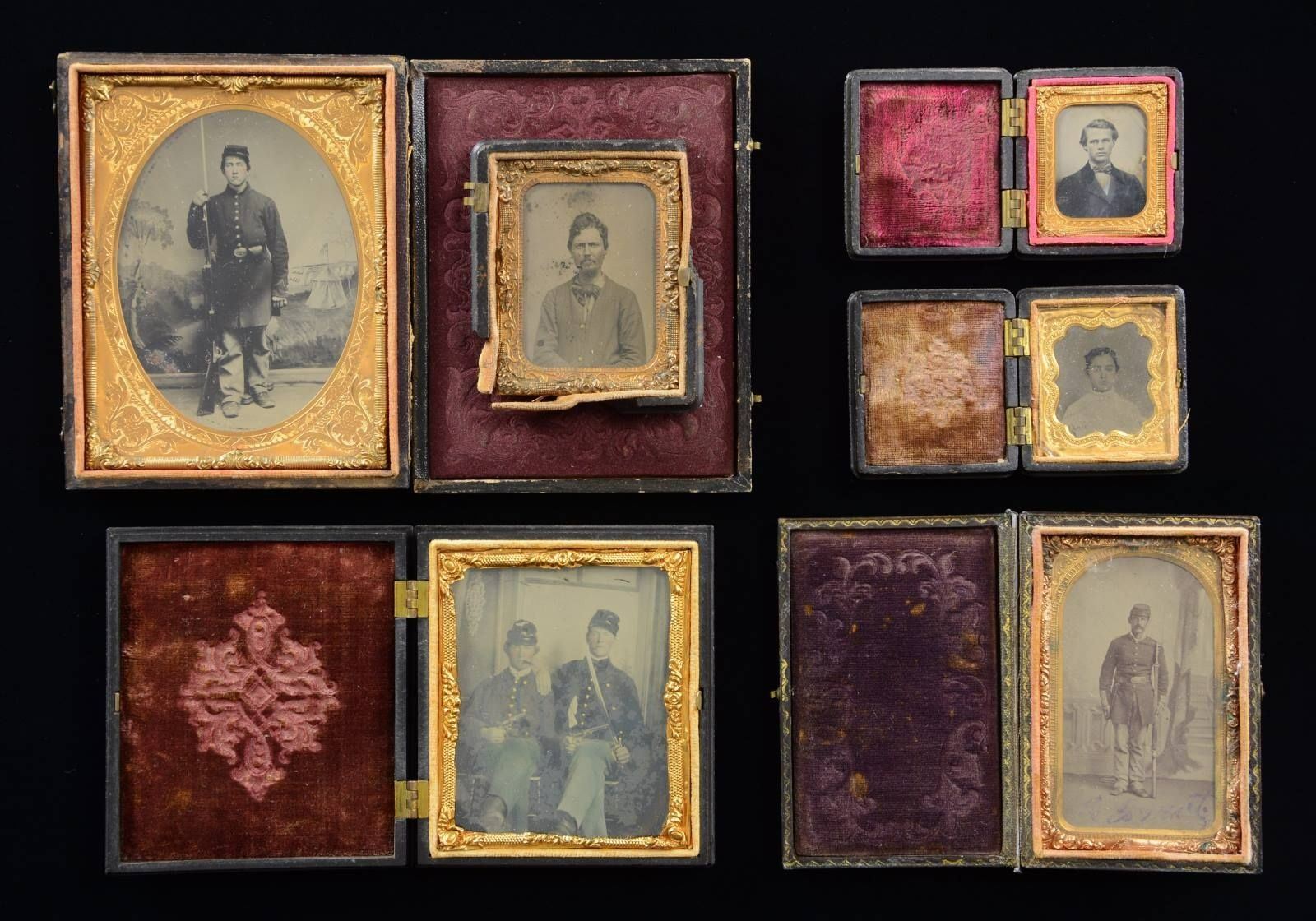 1) A 1/4 plate tintype photo of a standing Union Infantry Private wearing a 9-button frock coat. He has a standard issue kepi, and he wears an enlisted belt with brass “US” in oval buckle and a cap pouch at the front. On his right side is a bayonet & scabbard on the belt. He holds a musket with bayonet in his right hand. The backdrop is a camp scene showing tents & flags. Gilded brass mat & frame. Wood & paperboard case. CONDITION: image has no issues. Case is made up of parts from 2 different cases and there is no hinge. 2) A 6th plate ambrotype of 2 seated Federal Soldiers. They both appear to wear 4-button sack coats with vests beneath & blue kersey trousers. Each holds a pistol in their right hand, and one soldier has a non-regulation foot officer’s sword in his left hand. They both wear oil cloth kepis. The soldier on the right is smoking cheroot. Gilded brass frame with no mat. Thermoplastic case with label that reads, in part, “LITTLEFIELD, PARSONS & CO., DAGUERREOTYPE CASES”. CONDITION: image is quite nice with no damage. Case has a small crack in one corner. 3) A CDV size tintype of a soldier wearing an M1872 Infantry frock coat. He has a Civil War style belt with an oval brass “US” buckle. He wears a 45/70 bayonet scabbard on his right side. He has a musket in his left hand with fixed bayonet. The soldier is wearing a plain, unadorned kepi. Background is a studio drape. Gilded brass mat & frame. Wood & paperboard case. CONDITION: image is in fine condition and appears to be signed by the soldier below his feet. Mat & frame have a bit of verdigris. Case has a repaired hinge. 4) A 9th plate image showing a waist-up view of a Union Soldier wearing a 4-button sack coat. There is no equipment or other uniform parts visible. Gilded brass mat & frame. Partial thermoplastic case. CONDITION: image has a few bubbles & staining to the emulsion. The photo is mounted in half of a broken thermoplastic case. 5) A 16th plate chest-up view image of civilian gentleman. Gilded brass mat & frame. Thermoplastic case. CONDITION: light wear overall. 6) A 16th plate chest-up view image of civilian woman. Gilded brass mat & frame. Thermoplastic case. CONDITION: light wear overall. PROVENANCE: From the Lifelong Collection of Glen E. Mattox. (02-18486/BF). $700-1,000.