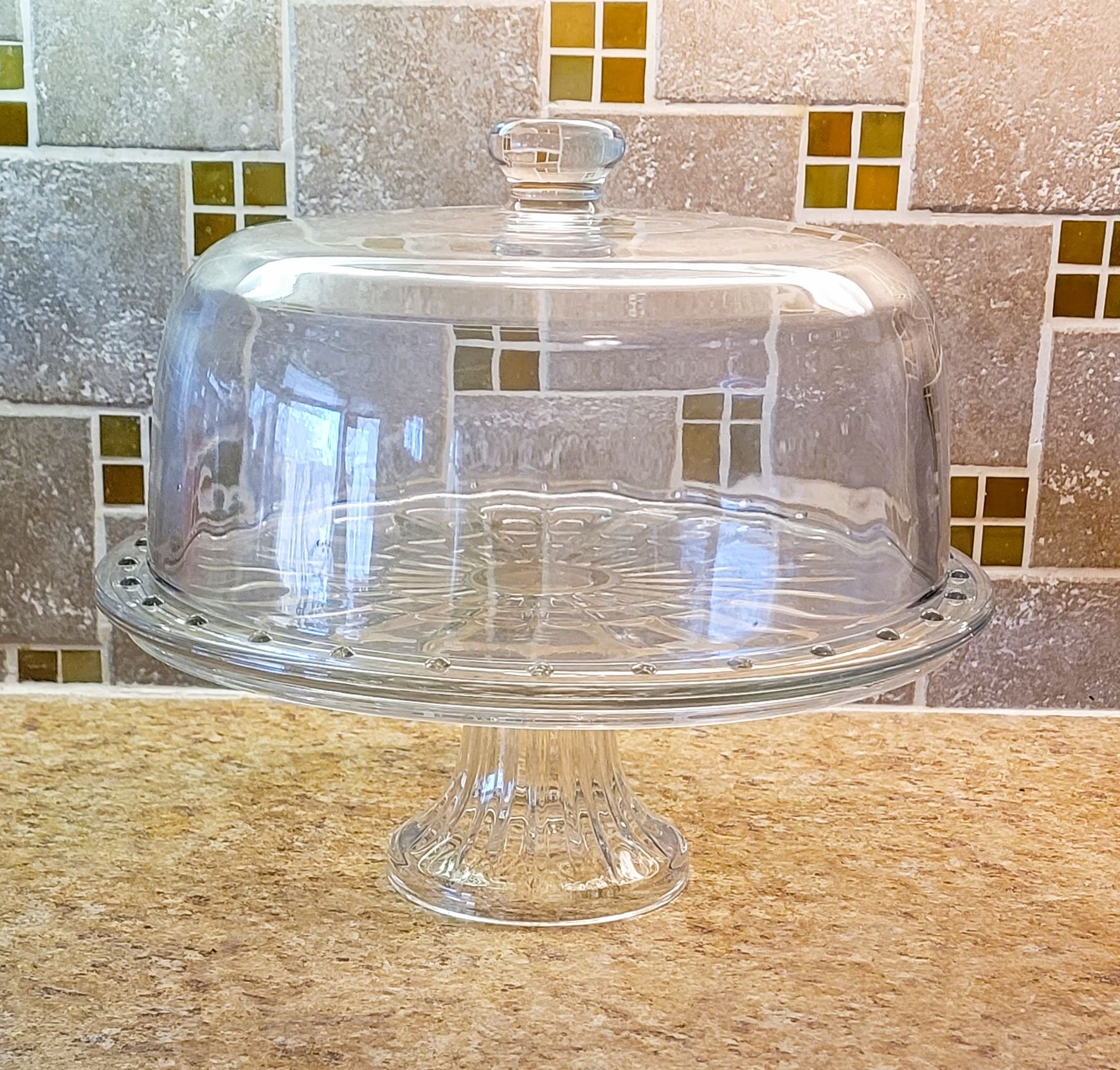 5) CLEAR GLASS CAKE STAND ON PEDESTAL, APPROX 12"