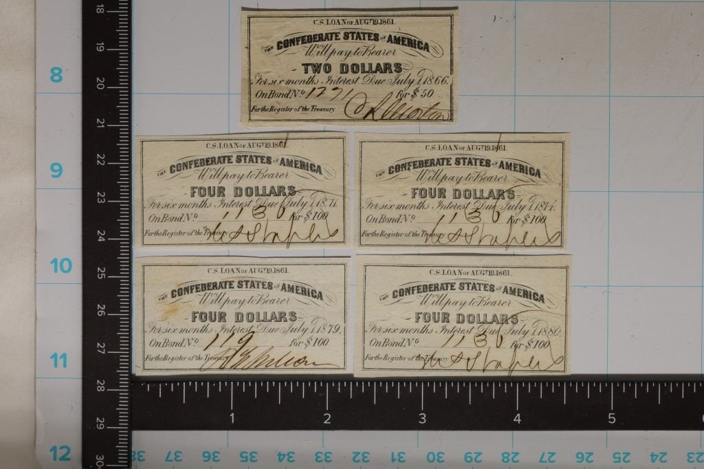 $4 DUE IN 1871, $4 DUE IN 1874, $4 DUE IN 1879 AND $4 DUE IN 1880, ALL CRISP UNC'S EXCEPT ONE IS EXTRA FINE+