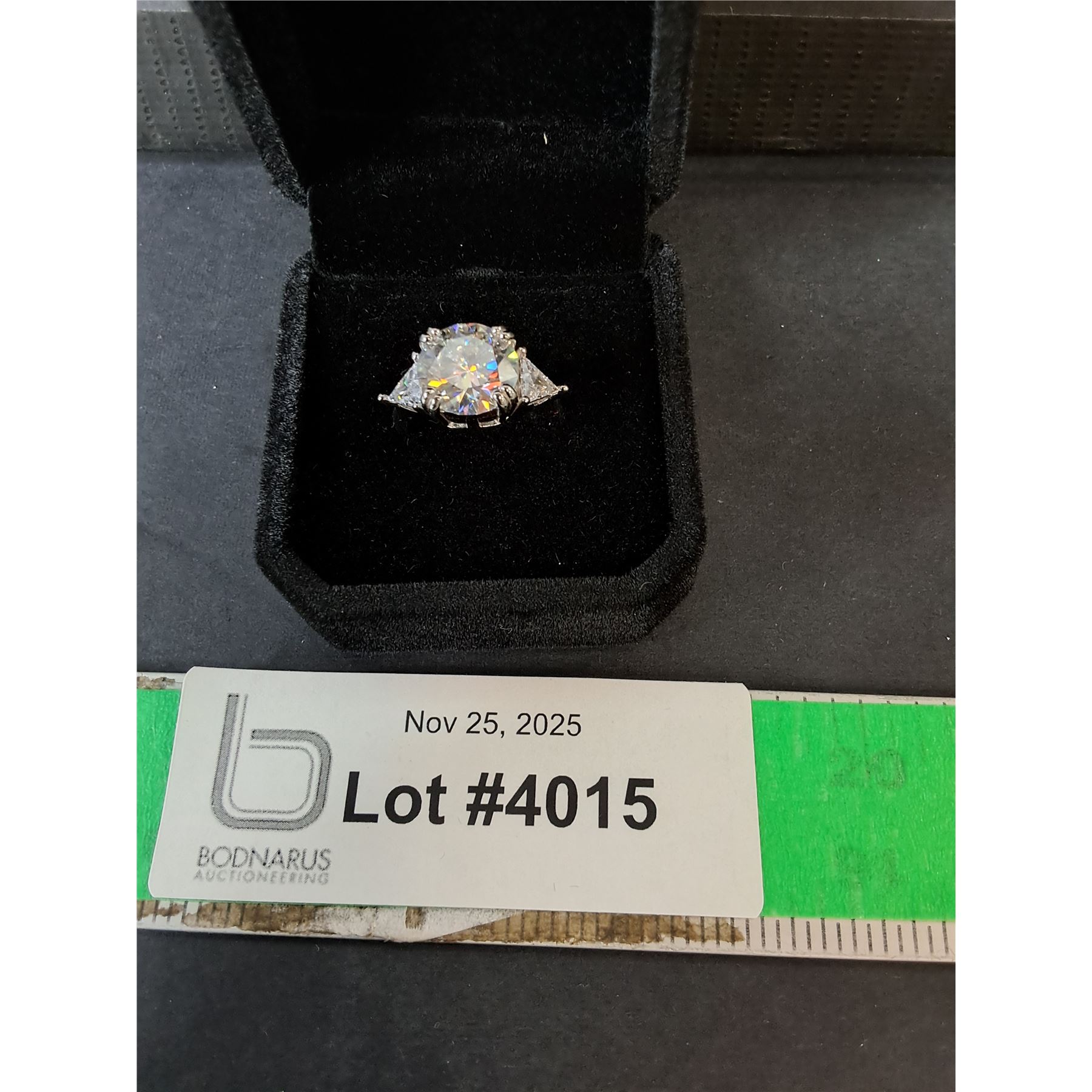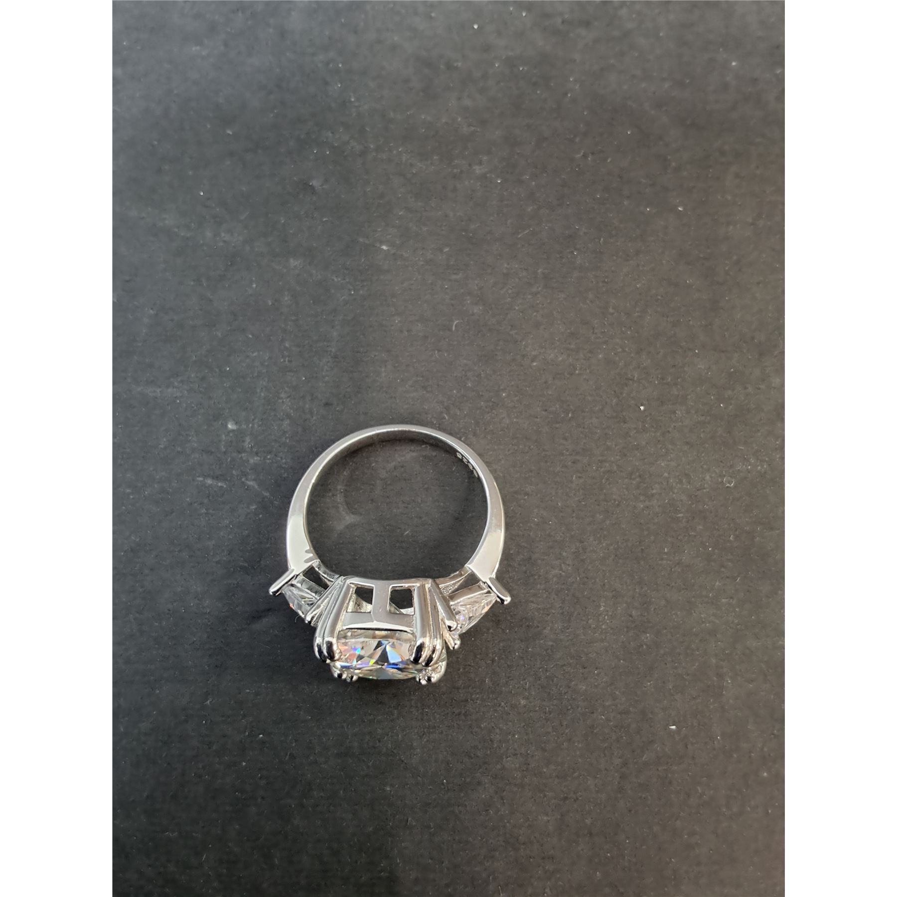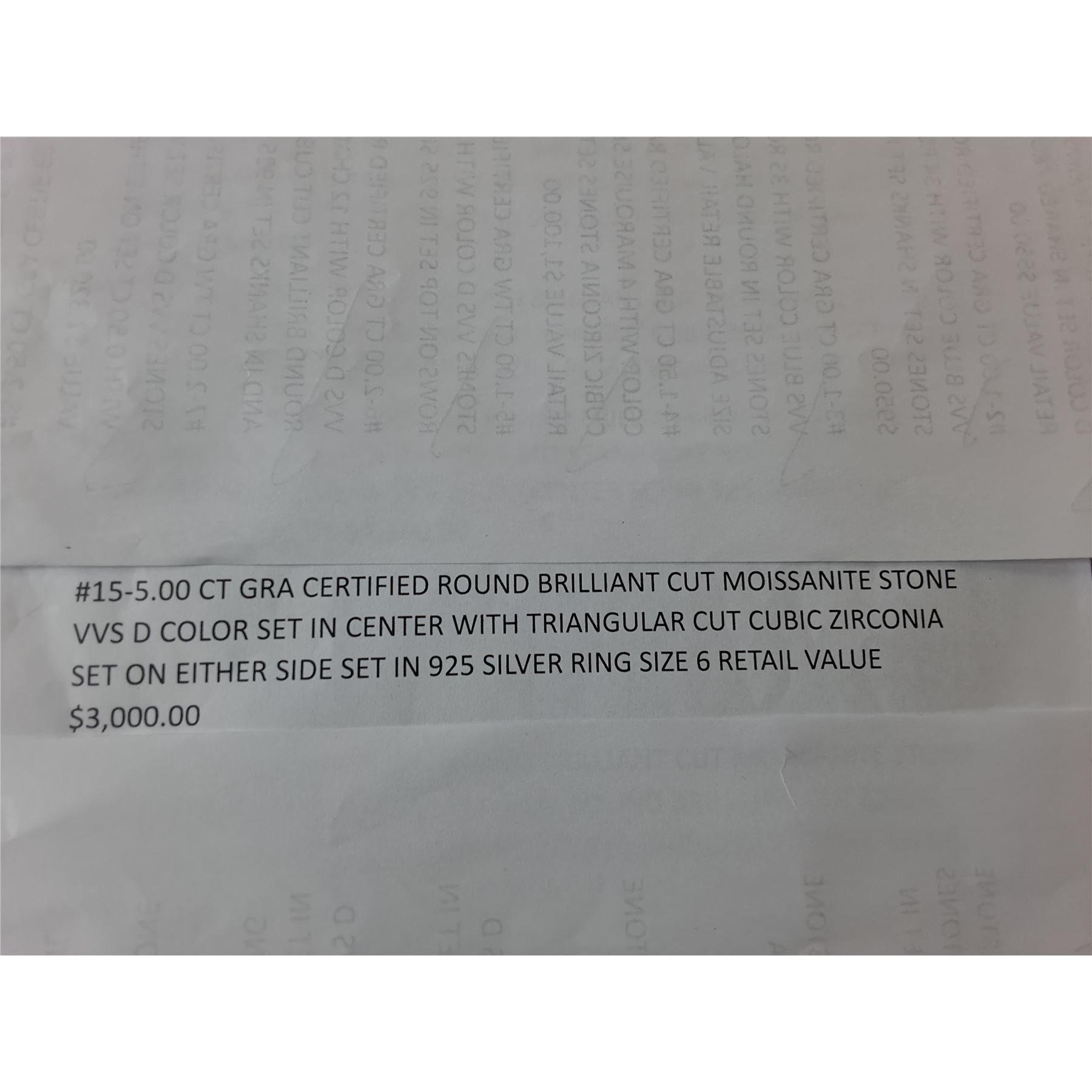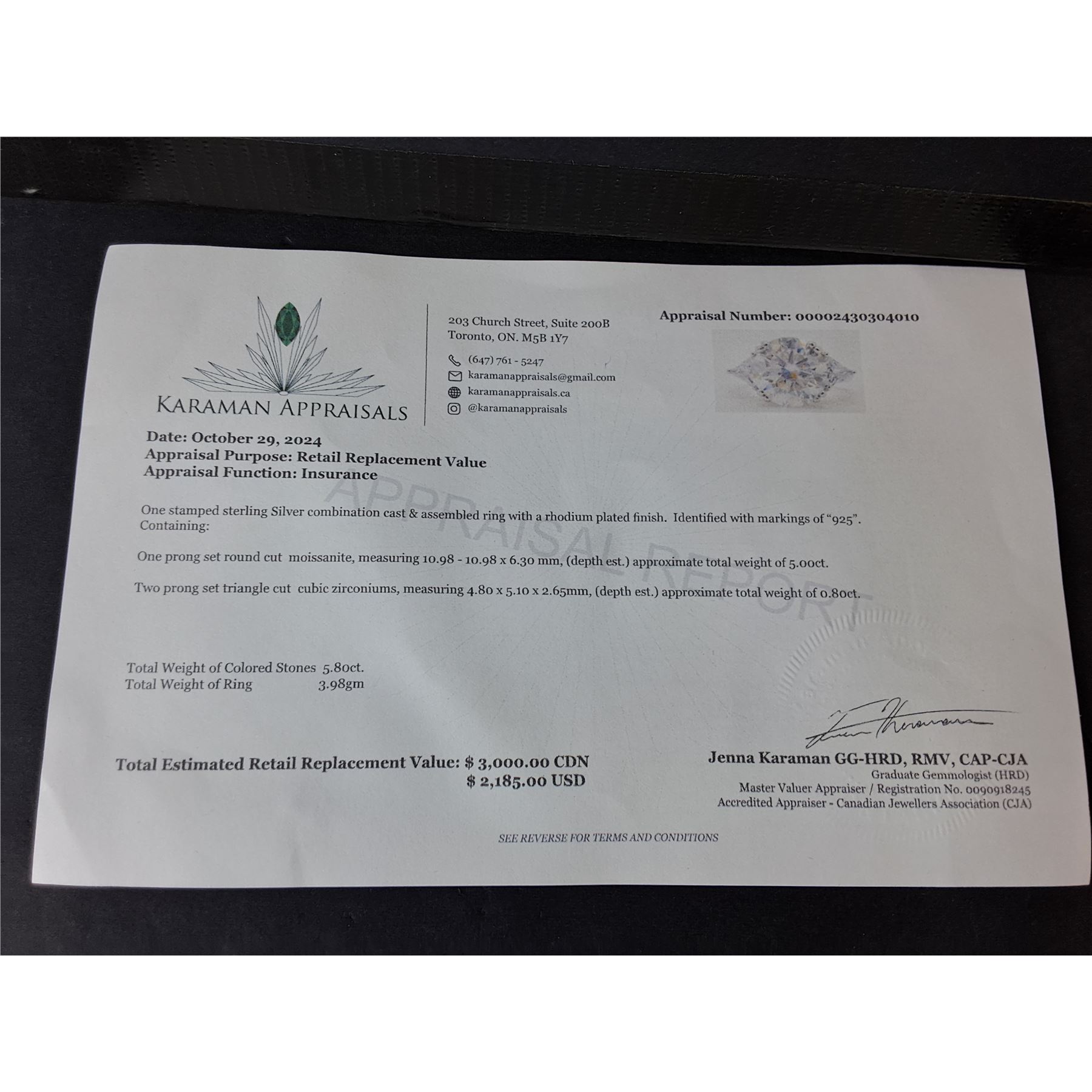 5.00 CT GRA CERTIFIED ROUND BRILLIANT CUT MOISSANITE STONE VVS D COLOR SET IN CENTER WITH TRIANGULAR CUT CUBIC ZIRCONIA SET ON EITHER SIDE SET IN 925 SILVER RING SIZE 6 RETAIL VALUE $3,000.00
